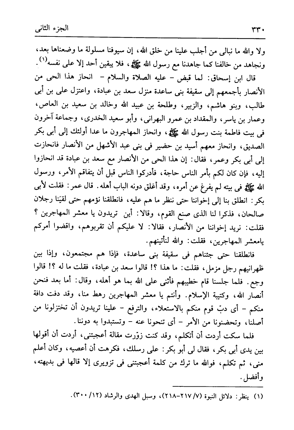 فِي بَيته لم يفرغ عَن أمره وَقد أغلق دونه الْبَاب أَهله قَالَ عمر فَقلت لأبي بكر انْطلق بِنَا إِلَى إِخْوَاننَا حَتَّى نَنْظُر مَا هم عَلَيْهِ فَانْطَلَقْنَا نؤمهم حَتَّى لقيَنا رجلَانِ صالحان فذكرا لنا الَّذِي صنع الْقَوْم وَقَالا أَيْن تُرِيدُونَ يَا معشر الْمُهَاجِرين فَقلت نُرِيد إِخْوَاننَا من الْأَنْصَار فَقَالَا لَا عَلَيْكُم أَن تقربوهم واقضوا أَمركُم يَا معشر الْمُهَاجِرين فَقلت وَالله لنأتينهم فَانْطَلَقْنَا حَتَّى جئناهم فِي سَقِيفَة بني سَاعِدَة فَإِذا هم مجتمعون وَإِذا بَين ظهرانيهم رجل مزمل فَقلت مَا هَذَا قَالُوا سعد بن عبَادَة فَقلت مَا لَهُ قَالُوا وجع فَلَمَّا جلسنا قَامَ خطيبهم فَأثْنى على الله بِمَا هُوَ أَهله وَقَالَ أما بعد فَنحْن أنصار الله وكتيبة الْإِسْلَام وَأَنْتُم يَا معشر الْمُهَاجِرين رَهْط منا وَقد دفت دافة مِنْكُم أَي دبّ قوم مِنْكُم بالاستعلاء والترفع علينا تُرِيدُونَ أَن تختزلونا من أصلنَا وتحضنونا من الْأَمر أَي تنحونا عَنهُ وتستبدوا بِهِ دُوننَا فَلَمَّا سكت أردْت أَن أَتكَلّم وَقد كنت زوّرت مقَالَة أعجبتني أردْت أَن أقولها بَين يَدي أبي بكر فَقَالَ لي أَبُو بكر على رسلك فَكرِهت أَن أعصيه وَكَانَ أعلم مني ثمَّ تكلم فوَاللَّه مَا ترك من كلمة أعجبتني فِي تزويري إِلَّا قَالَهَا فِي بديهته وَأفضل