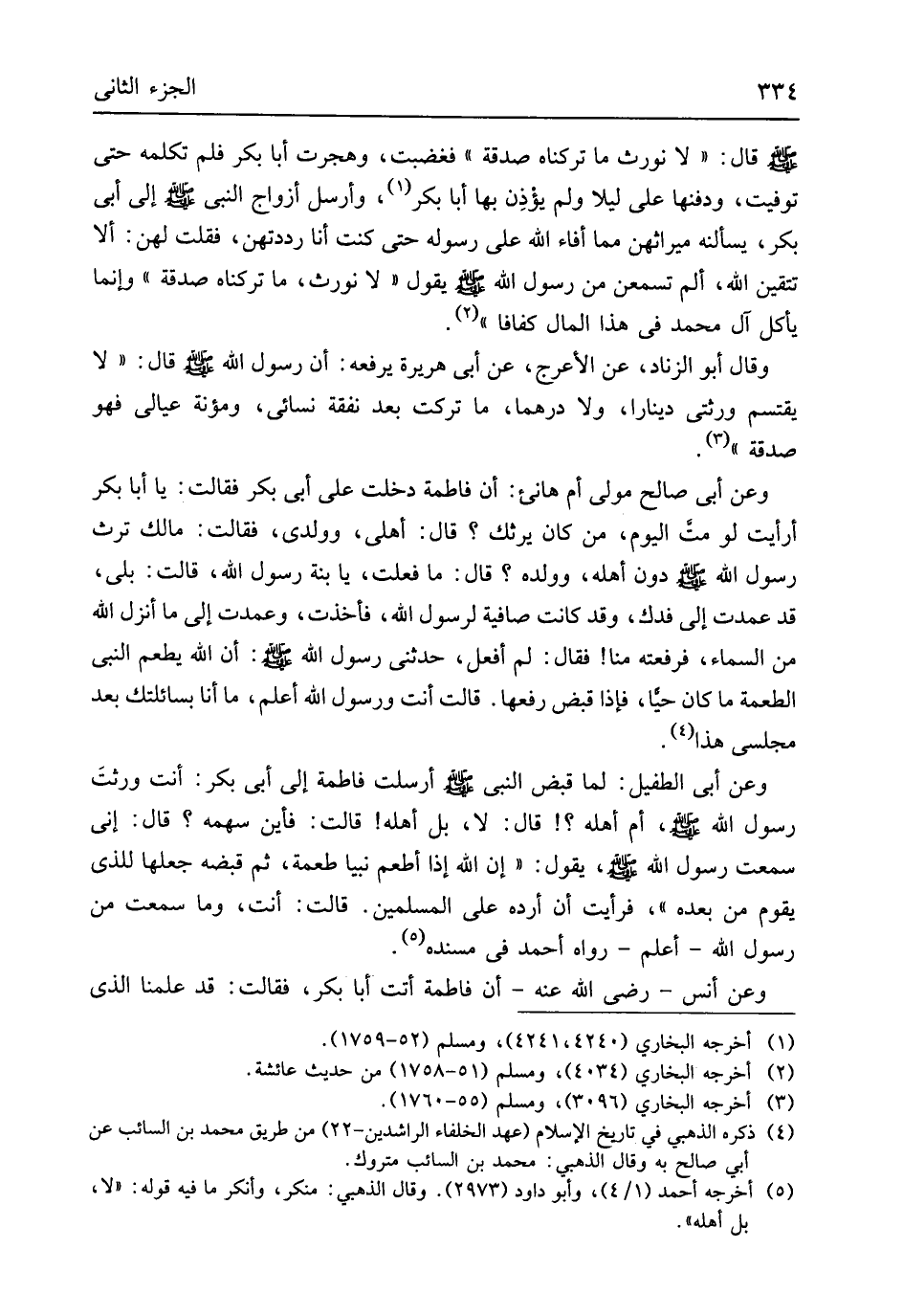 يَقُول إِن الله إِذا أطْعم نَبيا طعمة ثمَّ قَبضه جعلهَا للَّذي يقوم من بعده فَرَأَيْت أَن أرده على الْمُسلمين قَالَت أَنْت وَمَا سَمِعت من رَسُول الله أعلم رَوَاهُ أَحْمد فِي مُسْنده وَعَن أنس رَضِي الله عَنهُ أَن فَاطِمَة أَتَت أَبَا بكر فَقَالَت قد علمنَا الَّذِي