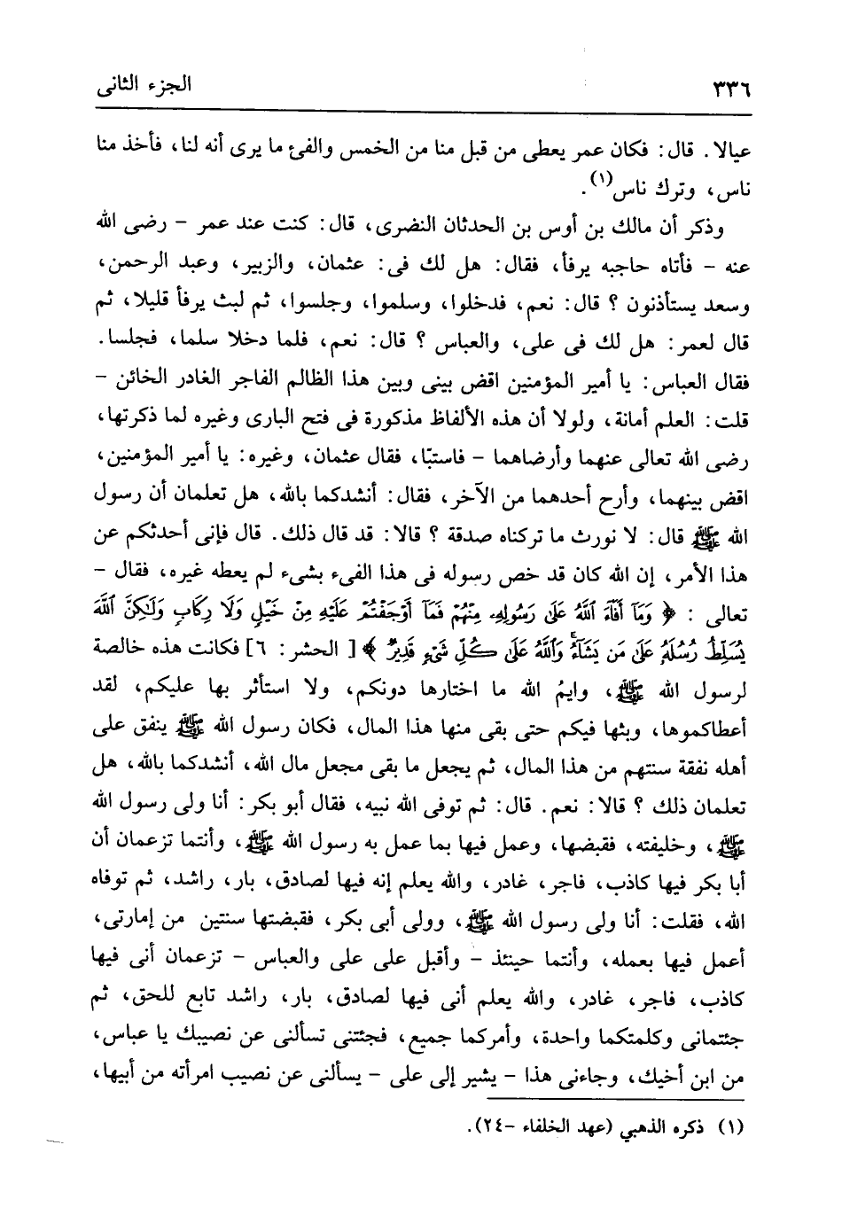 عيالاً قَالَ فَكَانَ عمر يُعْطي من قبل منا من الْخمس والفيء مَا يرى أَنه لنا فَأخذ منا نَاس وَترك نَاس وَذكر أَن مَالك بن أَوْس بن الْحدثَان النضري قَالَ كنت عِنْد عمر رَضِي الله عَنهُ فَأَتَاهُ حَاجِبه يرفأ فَقَالَ هَل لَك فِي عُثْمَان وَالزُّبَيْر وَعبد الرَّحْمَن وَسعد يستأذنون قَالَ نعم فَدَخَلُوا وسلموا وجلسوا ثمَّ لبث يرفأ قَلِيلا ثمَّ قَالَ لعمر هَل لَك فِي عَليّ وَالْعَبَّاس قَالَ نعم فَلَمَّا دخلا سلما فَجَلَسَا فَقَالَ الْعَبَّاس يَا أَمِير الْمُؤمنِينَ اقْضِ بيني وَبَين هَذَا الظَّالِم الْفَاجِر الغادر الخائن قلت الْعلم أَمَانَة وَلَوْلَا أَن هَذِه الْأَلْفَاظ مَذْكُورَة فِي فتح الْبَارِي وَغَيره لما ذكرتها رَضِي الله تَعَالَى عَنْهُمَا وأرضاهما فاستبّا فَقَالَ عُثْمَان وَغَيره يَا أَمِير الْمُؤمنِينَ اقْضِ بَينهمَا وأرح أَحدهمَا من الآخر فَقَالَ أنشدكما بِاللَّه هَل تعلمان أَن رَسُول الله