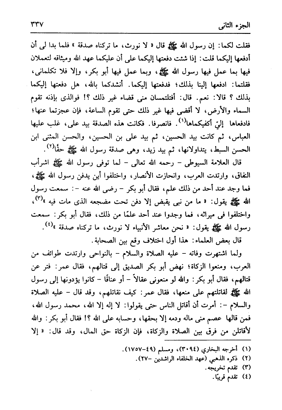 يَقُول نَحن معاشر الْأَنْبِيَاء لَا نورث مَا تَرَكْنَاهُ صَدَقَة قَالَ بعض الْعلمَاء هَذَا أول اخْتِلَاف وَقع بَين الصَّحَابَة وَلما اشتهرت وَفَاته عَلَيْهِ الصَّلَاة وَالسَّلَام بالنواحي وارتدت طوائف من الْعَرَب وَمنعُوا الزَّكَاة نَهَضَ أَبُو بكر الصّديق إِلَى قِتَالهمْ فَقَالَ عمر فتر عَن قِتَالهمْ فَقَالَ أَبُو بكر وَالله لَو مَنَعُونِي عقَالًا أَو عنَاقًا كَانُوا يؤدونها إِلَى رَسُول الله