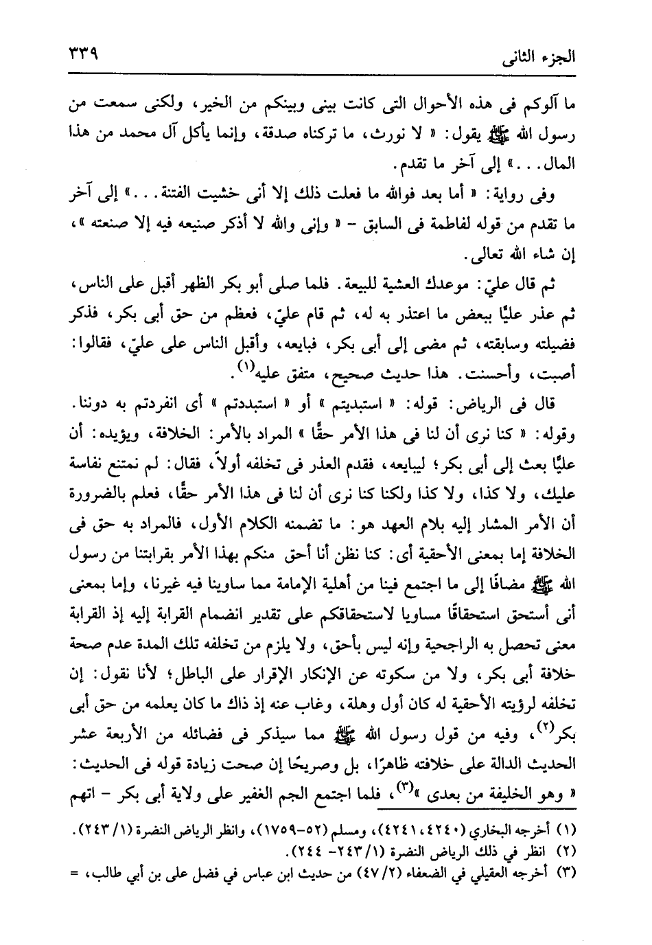 يَقُول لَا نورث مَا تَرَكْنَاهُ صَدَقَة وَإِنَّمَا يَأْكُل آل مُحَمَّد من هَذَا المَال ... إِلَى آخر مَا تقدم وَفِي رِوَايَة أما بعد فوَاللَّه مَا فعلت ذَلِك إِلَّا أَنِّي خشيت الْفِتْنَة. . إِلَى آخر مَا تقدم من قَوْله لفاطمة فِي السَّابِق وَإِنِّي وَالله لَا أذكر صَنِيعه فِيهِ إِلَّا صَنعته إِن شَاءَ الله تَعَالَى ثمَّ قَالَ عَليّ موعدك العشية لِلْبيعَةِ فَلَمَّا صلى أَبُو بكر الظّهْر أقبل على النَّاس ثمَّ عذر عليا بِبَعْض مَا اعتذر بِهِ لَهُ ثمَّ قَامَ عَليّ فَعظم من حق أبي بكر فَذكر فضيلته وسابقته ثمَّ مضى إِلَى أبي بكر فَبَايعهُ وَأَقْبل النَّاس على عَليّ فَقَالُوا أصبت وأحسنت هَذَا حَدِيث صَحِيح مُتَّفق عَلَيْهِ قَالَ فِي الرياض قَوْله استبديتم أَو استبددتم أَي انفردتم بِهِ دُوننَا وَقَوله كُنَّا نرى أَن لنا فِي هَذَا الْأَمر حَقًا المُرَاد بِالْأَمر الْخلَافَة وَيُؤَيِّدهُ أَن عليا بعث إِلَى أبي بكر ليبايعه فَقدم الْعذر فِي تخلفه أَولا فَقَالَ لم نمتنع نفاسة عَلَيْك وَلَا كَذَا وَلَا كَذَا وَلَكنَّا كُنَّا نرى أَن لنا فِي هَذَا الْأَمر حَقًا فَعلم بِالضَّرُورَةِ أَن الْأَمر الْمشَار إِلَيْهِ بلام الْعَهْد هُوَ مَا تضمنه الْكَلَام الأول فَالْمُرَاد بِهِ حق فِي الْخلَافَة إِمَّا بِمَعْنى الأحقية أَي كُنَّا نظن أَنا أَحَق مِنْكُم بِهَذَا الْأَمر بقرابتنا من رَسُول الله