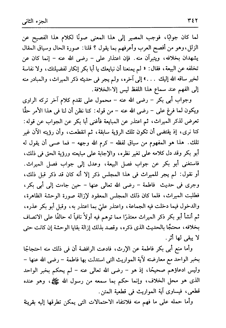 لما كَانَ جَوَابا فَوَجَبَ الْمصير إِلَى هَذَا الْمَعْنى صونا لكَلَام هَذَا الفصيح عَن الزلل وَهُوَ من أفْصح الْعَرَب وأعرفهم بِمَا يَقُول قُلْنَا صُورَة الْحَال وَسِيَاق الْمقَال يَشْهَدَانِ بِخِلَافِهِ ويتبرآن مِنْهُ فَإِن اعتذار عَليّ رَضِي الله عَنهُ إِنَّمَا كَانَ عَن تخلفه عَن الْبيعَة فَقَالَ لم يمنعنا أَن نُبَايِعك يَا أَبَا بكر إِنْكَار لفضيلتك وَلَا نفاسة لخير سَاقه الله إِلَيْك. . إِلَى آخِره وَلم يجر فِي حَدِيثه ذكر الْمِيرَاث والمبادر مِنْهُ إِلَى الْفَهم عِنْد سَماع هَذَا اللَّفْظ لَيْسَ إِلَّا الْخلَافَة وَجَوَاب أبي بكر رَضِي الله عَنهُ مَحْمُول على تقدم كَلَام آخر تَركه الرَّاوِي وَيكون لما فرغ عَليّ رَضِي الله عَنهُ من قَوْله كُنَّا نظن أَن لنا فِي هَذَا الْأَمر حَقًا تعرض لذكر الْمِيرَاث ثمَّ اعتذر عَن الْمُبَايعَة فأغنى أَبَا بكر عَن الْجَواب عَن قَوْله كُنَّا نرى إِذْ يَقْتَضِي أَن تكون تِلْكَ الرُّؤْيَة سَابِقَة ثمَّ انْقَطَعت وَأَن رُؤْيَته الْآن غير تِلْكَ هَذَا هُوَ الْمَفْهُوم من سِيَاق لَفظه كرم الله وَجهه فَمَا عَسى أَن يَقُول لَهُ أَبُو بكر وَقد دلّ كَلَامه على تغير نظره والإجابة على مبايعته ورؤية الْحق فِي ذَلِك فاستغنى أَبُو بكر عَن جَوَاب فصل الْبيعَة وَعدل إِلَى جَوَاب فصل الْمِيرَاث أَو نقُول لم يجر للميراث فِي هَذَا الْمجْلس ذكر إِلَّا أَنه كَانَ قد ذكر قبل ذَلِك وَجرى فِي حَدِيث فَاطِمَة رَضِي الله تَعَالَى عَنْهَا حِين جَاءَت إِلَى أبي بكر فطلبت الْمِيرَاث فَلَمَّا كَانَ ذَلِك الْمجْلس الْمَعْقُود لإِزَالَة صُورَة الوحشة الظَّاهِرَة وَالدُّخُول فِيمَا دخلت فِيهِ الْجَمَاعَة وَاعْتذر عَليّ بِمَا اعتذر بِهِ وَقبل أَبُو بكر عذره ثمَّ أنشأ أَبُو بكر ذكر الْمِيرَاث معتذراً مِمَّا توهم فِيهِ أَولا نافياً لَهُ حَالفا على الاتصاف بِخِلَافِهِ محتجاً بِالْحَدِيثِ الَّذِي ذكره وَقصد بذلك إِزَالَة بقايا الوحشة إِن كَانَت حَتَّى لَا يبْقى لَهَا أثر وَأما منع أبي بكر فَاطِمَة عَن الْإِرْث فادعت الرافضة أَن فِي ذَلِك مِنْهُ احتجاجاً بِخَبَر الْوَاحِد مَعَ معارضته لآيَة الْمَوَارِيث الَّتِي استدلت بهَا فَاطِمَة رَضِي الله عَنْهَا وَلَيْسَ ادعاؤهم صَحِيحا إِذْ هُوَ رَضِي الله تَعَالَى عَنهُ لم يحكم بِخَبَر الْوَاحِد الَّذِي هُوَ مَحل الْخلاف وَإِنَّمَا حكم بِمَا سَمعه من رَسُول الله