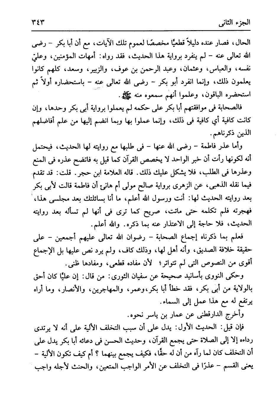 فالصحابة فِي موافقتهم أَبَا بكر على حكمه لم يعملوا بِرِوَايَة أبي بكر وَحدهَا وَإِن كَانَت كَافِيَة أَي كَافِيَة فِي ذَلِك وَإِنَّمَا عمِلُوا بهَا وَبِمَا انْضَمَّ إِلَيْهَا من علم أفاضلهم الَّذين ذَكَرْنَاهُمْ وَأما عذر فَاطِمَة رَضِي الله عَنْهَا فِي طلبَهَا مَعَ رِوَايَته لَهَا الحَدِيث فَيحْتَمل أَنه لكَونهَا رَأَتْ أَن خبر الْوَاحِد لَا يخصص الْقُرْآن كَمَا قيل بِهِ فاتضح عذره فِي الْمَنْع وعذرها فِي الطّلب فَلَا يشكل عَلَيْك ذَلِك قَالَ الْعَلامَة ابْن حجر قلت قد تقدم فِيمَا نَقله الذَّهَبِيّ عَن الزُّهْرِيّ بِرِوَايَة صَالح مولى أم هانىء أَن فَاطِمَة قَالَت لأبي بكر بعد رِوَايَته الحَدِيث لَهَا أَنْت وَرَسُول الله أعلم مَا أَنا بسائلتك بعد مجلسي هَذَا فَهجرَته فَلم تكمله حَتَّى مَاتَت صَرِيح كَمَا ترى فِي أَنَّهَا لم تسأله بعد رِوَايَته الحَدِيث فَلَا حَاجَة إِلَى الِاعْتِذَار عَنهُ بِمَا ذكره وَالله أعلم فَعلم بِمَا ذَكرْنَاهُ إِجْمَاع الصَّحَابَة رضوَان الله تَعَالَى عَلَيْهِم أَجْمَعِينَ على حَقِيقَة خلَافَة الصّديق وَأَنه أهل لَهَا وَذَلِكَ كَاف وَلم يرد نَص عَلَيْهَا بل الْإِجْمَاع أقوى من النُّصُوص الَّتِي لم تتواتر لِأَن مفاده قَطْعِيّ وَمفَاده ظَنِّي وَحكى النَّوَوِيّ بأسانيد صَحِيحَة عَن سُفْيَان الثَّوْريّ من قَالَ إِن عليا كَانَ أَحَق بِالْولَايَةِ من أبي بكر فقد خطأ أَبَا بكر وَعمر والمهاجرين وَالْأَنْصَار وَمَا أرَاهُ يرْتَفع لَهُ مَعَ هَذَا عمل إِلَى السَّمَاء وَأخرج الدَّارَقُطْنِيّ عَن عمار بن يَاسر نَحوه فَإِن قيل الحَدِيث الأول يدل على أَن سَبَب التَّخَلُّف الألية على أَنه لَا يرتدى رِدَاءَهُ إِلَّا إِلَى الصَّلَاة حَتَّى يجمع الْقرَان وَحَدِيث الْحسن فِي دُعَائِهِ أَبَا بكر يدل على أَن التَّخَلُّف كَانَ لما رَآهُ من أَن لَهُ حَقًا فَكيف يجمع بَينهمَا أم كَيفَ تكون الألية يعْنى الْقسم عذرا فِي التَّخَلُّف عَن الْأَمر الْوَاجِب الْمُتَعَيّن والحنث لأَجله وَاجِب