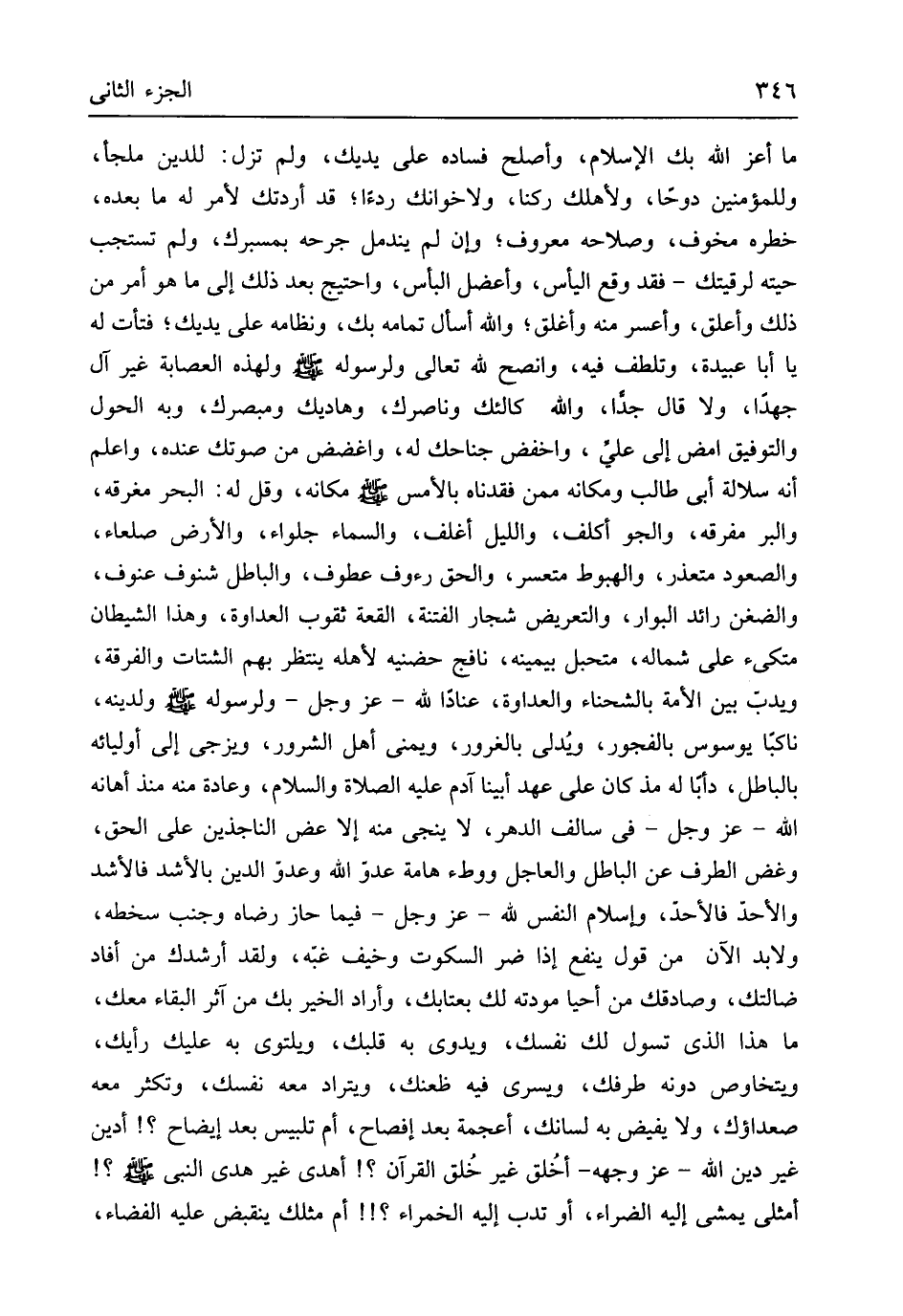 مَا أعز الله بك الْإِسْلَام وَأصْلح فَسَاده على يَديك وَلم تزل للدّين ملْجأ وَلِلْمُؤْمنِينَ دوحاً ولأهلك ركنا ولاخوانك ردْءًا قد أردتك لأمر لَهُ مَا بعده خطره مخوف وصلاحه مَعْرُوف وَإِن لم يندمل جرحه بمسبرك وَلم تستجب حيته لرقيتك فقد وَقع الْيَأْس وأعضل الْبَأْس واحتيج بعد ذَلِك إِلَى مَا هُوَ أَمر من ذَلِك وأعلق وأعسر مِنْهُ وأغلق وَالله أسأَل تَمَامه بك ونظامه على يَديك فتأت لَهُ يَا أَبَا عُبَيْدَة وتلطف فِيهِ وانصح لله تَعَالَى وَلِرَسُولِهِ