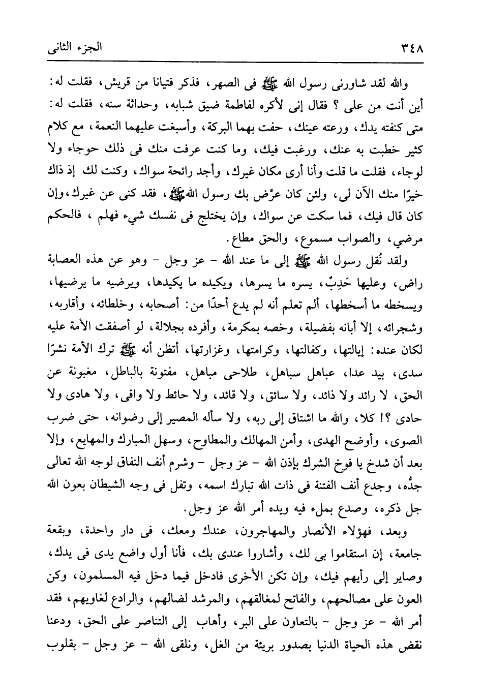 ترك الْأمة نشرا سدى بَين عدا عباهل سباهل طلاحى مباهل مَفْتُونَة بِالْبَاطِلِ مغبونة عَن الْحق لَا رائد وَلَا ذائد وَلَا سائق وَلَا قَائِد وَلَا حَائِط وَلَا واقي وَلَا هادي وَلَا حادي كلا وَالله مَا اشتاق إِلَى ربه وَلَا سَأَلَهُ الْمصير إِلَى رضوانه حَتَّى ضرب الصوى وأوضح الْهدى وَأمن المهالك والمطاوح وَسَهل الْمُبَارك والمهايع وَإِلَّا بعد أَن شدخ يَا فوخ الشّرك بِإِذن الله عز وَجل وشرم أنف النِّفَاق لوجه الله تَعَالَى جدُّه وجدع أنف الْفِتْنَة فِي ذَات الله تبَارك اسْمه وتفل فِي وَجه الشَّيْطَان بعون الله جلّ ذكره وصدع بملء فِيهِ وَيَده أَمر الله عز وَجل وَبعد فَهَؤُلَاءِ الْأَنْصَار والمهاجرون عنْدك ومعك فِي دَار وَاحِدَة وبقعة جَامِعَة إِن استقاموا بِي لَك وأشاروا عِنْدِي بك فَأَنا أول وَاضع يَدي فِي يدك وصاير إِلَى رَأْيهمْ فِيك وَإِن تكن الْأُخْرَى فَادْخُلْ فِيمَا دخل فِيهِ الْمُسلمُونَ وَكن العون على مصالحهم والفاتح لمغالقهم والمرشد لضالهم والرادع لغاويهم فقد أَمر الله عز وَجل بالتعاون على الْبر وأهاب إِلَى التناصر على الْحق وَدعنَا نقض هَذِه الْحَيَاة الدُّنْيَا بصدور بريئة من الغل ونلقى الله عز وَجل بقلوب