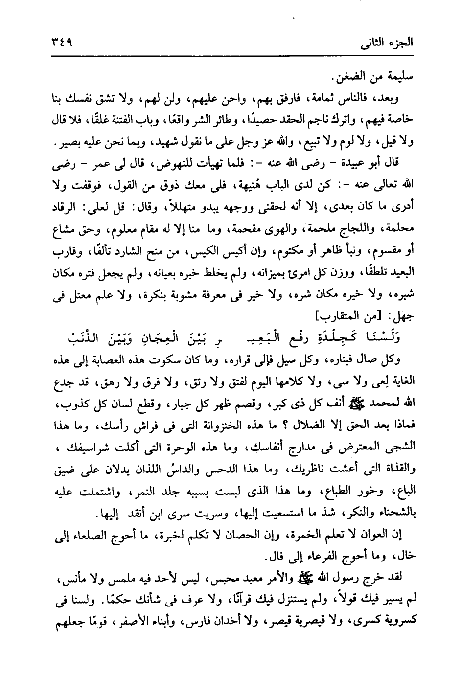 سليمَة من الضغن وَبعد فَالنَّاس ثُمَامَة فارفق بهم واحن عَلَيْهِم وَلنْ لَهُم وَلَا تشق نَفسك بِنَا خَاصَّة فيهم واترك ناجم الحقد حصيدا وطائر الشد وَاقعا وَبَاب الْفِتْنَة غلقاً فَلَا قَالَ وَلَا قيل وَلَا لوم وَلَا تبيع وَالله عز وَجل على مَا نقُول شَهِيد وَبِمَا نَحن عَلَيْهِ بَصِير قَالَ أَبُو عُبَيْدَة رَضِي الله عَنهُ فَلَمَّا تهيأت للنهوض قَالَ لي عمر رَضِي الله تَعَالَى عَنهُ كن لَدَى الْبَاب هُنيهة فلي مَعَك ذوق من القَوْل فوقفت وَلَا أَدْرِي مَا كَانَ بعدِي إِلَّا أَنه لَحِقَنِي وَوَجهه يَبْدُو متهللاً وَقَالَ قل لعَلي الرقاد محلمة واللجاج ملحمة والهوى مقحمة وَمَا منا إِلَّا لَهُ مقَام مَعْلُوم وَحقّ مشَاع أَو مقسوم ونبأ ظَاهر أَو مَكْتُوم وَإِن أَكيس الْكيس من منح الشارد تألفاً وقارب الْبعيد تلطفا وَوزن كل امرىء بميزانه وَلم يخلط خَبره بعيانه وَلم يَجْعَل فتره مَكَان شبره وَلَا خَيره مَكَان شَره وَلَا خير فِي معرفَة مشوبة بنكرة وَلَا علم معتل فِي جهل // (من المتقارب) //
