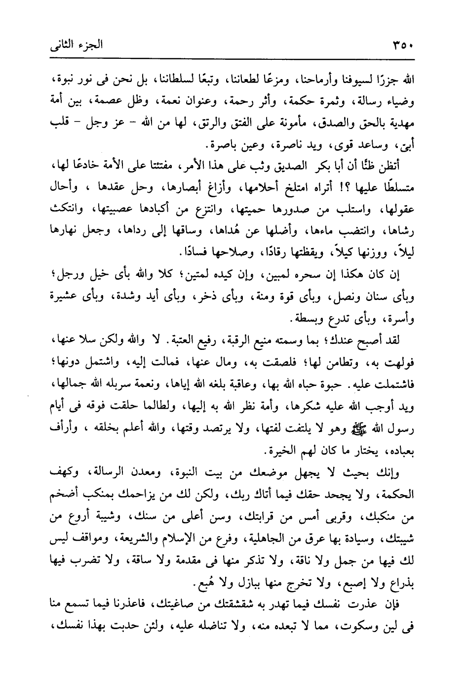 الله جزراً لسيوفنا وأرماحنا ومزعاً لطعاننا وتبعاً لسلطاتنا بل نَحن فِي نور نبوة وضياء رِسَالَة وَثَمَرَة حِكْمَة وَأثر رَحْمَة وعنوان نعْمَة وظل عصمَة بَين أمة مهدية بِالْحَقِّ والصدق مَأْمُونَة على الفتق والرتق لَهَا من الله عز وَجل قلب أبي وساعد قوي وَيَد ناصرة وَعين باصرة أتظن ظنا أَن أَبَا بكر الصّديق وثب على هَذَا الْأَمر مفتئتا على الْأمة خادعاً لَهَا متسلطاً عَلَيْهَا أتراه امتلخ أحلامها وأزاغ أبصارها وَحل عقدهَا وأحال عقولها واستلب من صدروها حميتها وانتزع من أكبادها عصبيتها وانتكث رشاها وانتضب ماءها وأضلها عَن هُداها وساقها إِلَى رداها وَجعل نَهَارهَا لَيْلًا ووزنها كَيْلا ويقظتها رقاداً وصلاحها فَسَادًا إِن كَانَ هَكَذَا إِن سحره لمبين وَإِن كَيده لمتين كلا وَالله بِأَيّ خيل وَرجل وَبِأَيِّ سِنَان ونصل وَبِأَيِّ قُوَّة ومنة وَبِأَيِّ ذخر وَبِأَيِّ أيد وَشدَّة وَبِأَيِّ عشيرة وأسرة وَبِأَيِّ تدرع وبسطة لقد أصبح عنْدك بِمَا وسمته منيع الرَّقَبَة رفيع العتبة لَا وَالله وَلَكِن سلا عَنْهَا فولهت بِهِ وتطامن لَهَا فلصقت بِهِ وَمَال عَنْهَا فمالت إِلَيْهِ واشتمل دونهَا فاشتملت عَلَيْهِ حبوة حباه الله بهَا وعاقبة بلغه الله إِيَّاهَا ونعمة سربله الله جمَالهَا وَيَد أوجب الله عَلَيْهِ شكرها وَأمة نظر الله بِهِ إِلَيْهَا ولطالما حلقت فَوْقه فِي أَيَّام رَسُول الله