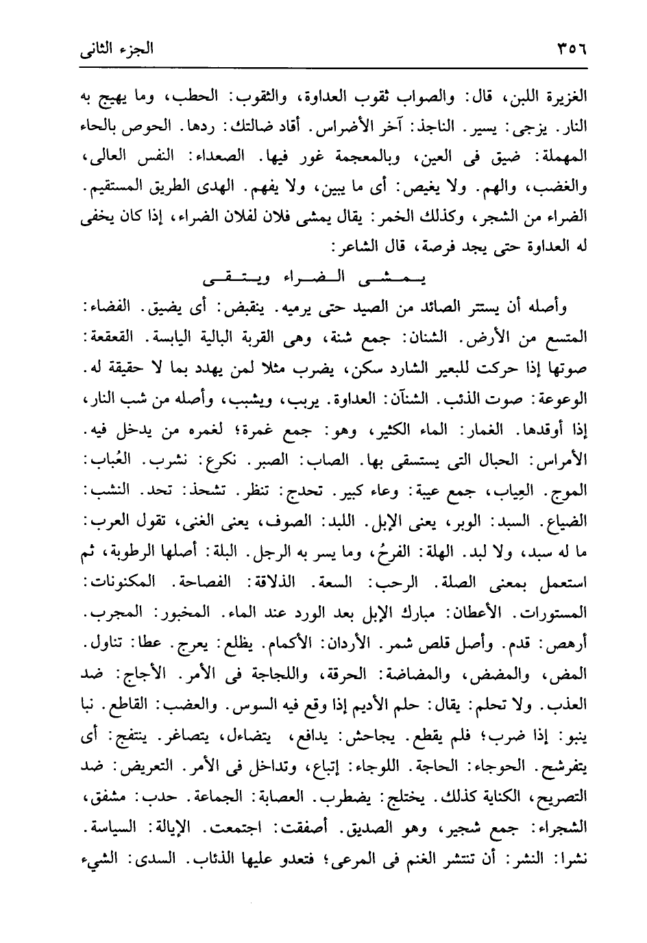 وَأَصله أَن يسْتَتر الصَّائِد من الصَّيْد حَتَّى يرميه ينقبض أَي يضيق الفضاء المتسع من الأَرْض الشنان جمع شنة وَهِي الْقرْبَة البالية الْيَابِسَة القعقعة صَوتهَا إِذا حركت للبعير الشارد سكن يضْرب مثلا لمن يهدد بِمَا لَا حَقِيقَة لَهُ الوعوعة صَوت الذِّئْب الشنآن الْعَدَاوَة يربب ويشبب وَأَصله من شب النَّار إِذا أوقدها الغمار المَاء الْكثير وَهُوَ جمع غمرة لغمره من يدْخل فِيهِ الأمراس الحبال الَّتِي يستسقى بهَا الصاب الصَّبْر نكرع نشرب العُباب الموج العِياب جمع عَيْبَة وعَاء كَبِير تحدج تنظر تشحذ تحد النشب الضّيَاع السبد الْوَبر يَعْنِي الْإِبِل اللبد الصُّوف يَعْنِي الْغنى تَقول الْعَرَب مَا لَهُ سبد وَلَا لبد الهلة الفرحُ وَمَا يسر بِهِ الرجل البلة أَصْلهَا الرُّطُوبَة ثمَّ اسْتعْمل بِمَعْنى الصِّلَة الرحب السعَة الذلاقة الفصاحه المكنونات المستورات الأعطان مبارك الْإِبِل بعد الْورْد عِنْد المَاء المخبور المجرب أرهص قدم وأصل قلص شمر الأردان الأكمام يظلع يعرج عطا تنَاول المض والمضض والمضاضة الحرقة واللجاجة فِي الْأَمر الأجاج ضد العذب وَلَا تحلم يُقَال حلم الْأَدِيم إِذا وَقع فِيهِ السوس والعضب الْقَاطِع نبا ينبو إِذا ضرب فَلم يقطع يجاحش يدافع يتضاءل يتصاغر ينتفج أَي يتفرشح الحوجاء الْحَاجة اللوجاء إتباع وتداخل فِي الْأَمر التَّعْرِيض ضد التَّصْرِيح الْكِنَايَة كَذَلِك يختلج يضطرب الْعِصَابَة الْجَمَاعَة حدب مُشفق الشجراء جمع شجير وَهُوَ الصّديق أصفقت اجْتمعت الإيالة السياسة نشرا النشر أَن تَنْتَشِر الْغنم فِي المرعى فتعدو عَلَيْهَا الذئاب السدى الشَّيْء