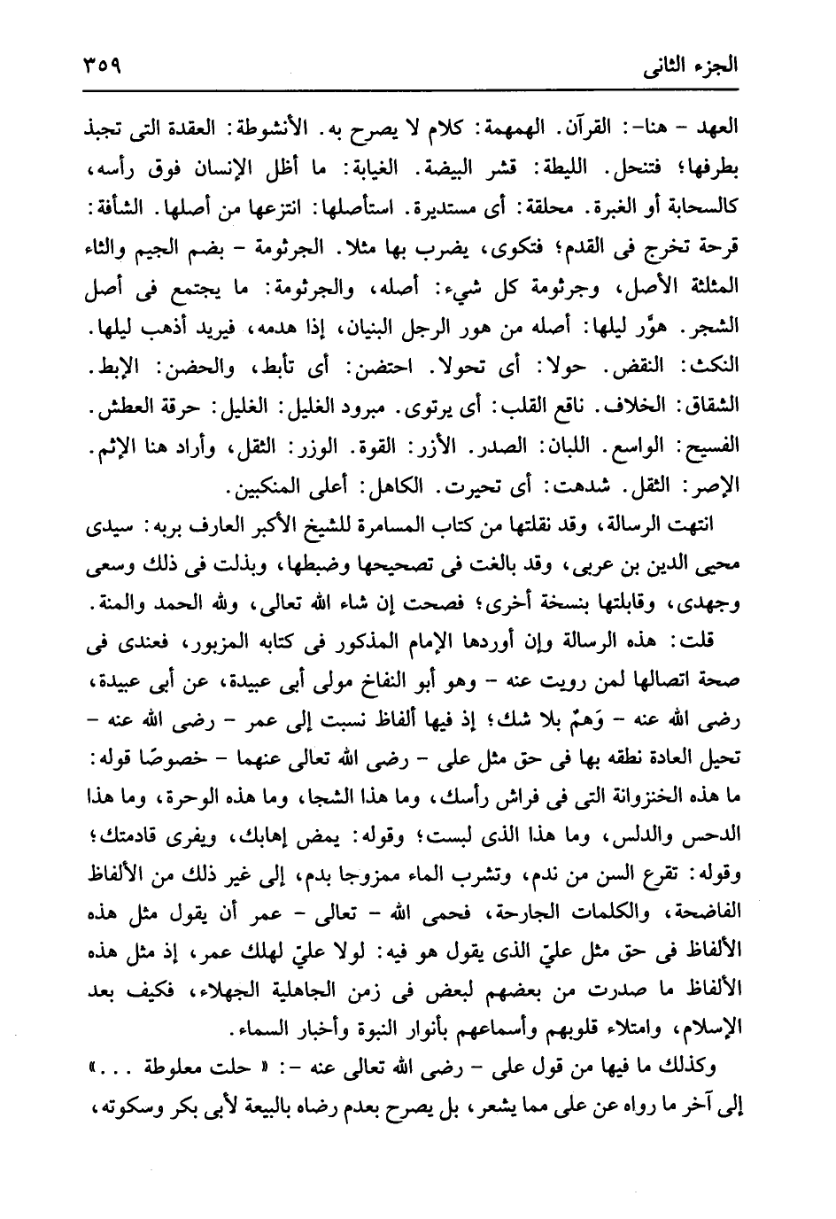 الْعَهْد هُنَا الْقرَان الهمهمة كَلَام لَا يُصَرح بِهِ الأنشوطة الْعقْدَة الَّتِي تجبذ بطرفها فتنحل الليطة قشر الْبَيْضَة الغيابة مَا أظل الْإِنْسَان فَوق رَأسه كالسحابة أَو الغبرة محلقة أَي مستديرة استأصلها انتزعها من أَصْلهَا الشأفة قرحَة تخرج فِي الْقدَم فتكوى يضْرب بهَا مثلا الجرثومة بِضَم الْجِيم والثاء الْمُثَلَّثَة الأَصْل وجرثومة كل شَيْء أَصله والجرثومة مَا يجْتَمع فِي أصل الشّجر هوَّر لَيْلهَا أَصله من هور الرجل الْبُنيان إِذا هَدمه فيريد أذهب لَيْلهَا النكث النَّقْض حولا أَي تحولاً احتضن أَي تأبط والحضن الْإِبِط الشقاق الْخلاف ناقع الْقلب أَي يرتوي مبرود الغليل الغليل حرقة الْعَطش الفسيح الْوَاسِع اللبان الصَّدْر الأزر الْقُوَّة الْوزر الثّقل وَأَرَادَ هُنَا الْإِثْم الإصر الثّقل شدهت أَي تحيرت الْكَاهِل أَعلَى الْمَنْكِبَيْنِ انْتَهَت الرسَالَة وَقد نقلتها من كتاب المسامرة للشَّيْخ الْأَكْبَر الْعَارِف بربه سَيِّدي محيي الدّين بن عَرَبِيّ وَقد بالغت فِي تصحيحها وضبطها وبذلت فِي ذَلِك وسعي وجهدي وقابلتها بنسخة أُخْرَى فَصحت إِن شَاءَ الله تَعَالَى وَللَّه الْحَمد والْمنَّة قلت هَذِه الرسَالَة وَإِن أوردهَا الإِمَام الْمَذْكُور فِي كِتَابه الْمَزْبُور فعندي فِي صِحَة اتصالها لمن رويت عَنهُ وَهُوَ أَبُو النفاخ مولى أبي عُبَيْدَة عَن أبي عُبَيْدَة رَضِي الله عَنهُ وَهم بِلَا شكّ إِذْ فِيهَا أَلْفَاظ نسبت إِلَى عمر رَضِي الله عَنهُ تحيل الْعَادة نطقه بهَا فِي حق مثل عَليّ رَضِي الله تَعَالَى عَنْهُمَا خُصُوصا قَوْله مَا هَذِه الخنزوانة الَّتِي فِي فرَاش رَأسك وَمَا هَذَا الشجا وَمَا هَذِه الوحرة وَمَا هَذَا الدحس والدلس وَمَا هَذَا الَّذِي لبست وَقَوله يمض إهابك ويفري قادمتك وَقَوله تقرع السن من نَدم وتشرب المَاء ممزوجاً بِدَم إِلَى غير ذَلِك من الْأَلْفَاظ الفاضحة والكلمات الْجَارِحَة فحمى الله تَعَالَى عمر أَن يَقُول مثل هَذِه الْأَلْفَاظ فِي حق مثل عليّ الَّذِي يَقُول هُوَ فِيهِ لَوْلَا عَليّ لهلك عمر إِذْ مثل هَذِه الْأَلْفَاظ مَا صدرت من بَعضهم لبَعض فِي زمن الْجَاهِلِيَّة الجهلاء فَكيف بعد الْإِسْلَام وامتلاء قُلُوبهم وأسماعهم بأنوار النُّبُوَّة وأخبار السَّمَاء وَكَذَلِكَ مَا فِيهَا من قَول عَليّ رَضِي الله تَعَالَى عَنهُ حلت معلوطة ... إِلَى آخر مَا رَوَاهُ عَن عَليّ مِمَّا يشْعر بل يُصَرح بِعَدَمِ رِضَاهُ بالبيعة لأبي بكر وسكوته