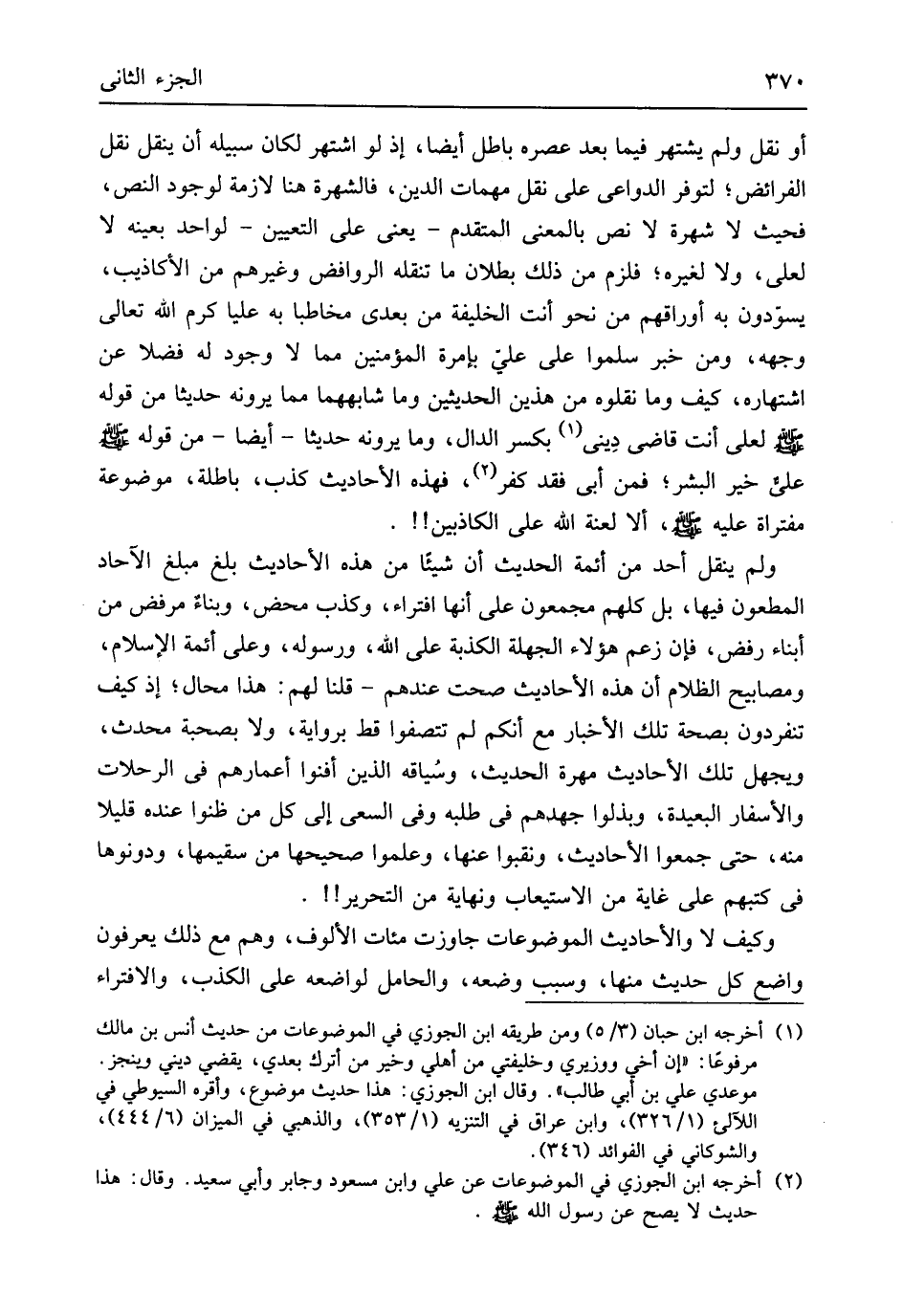 أَلا لعنة الله على الْكَاذِبين وَلم ينْقل أحد من أَئِمَّة الحَدِيث أَن شَيْئا من هَذِه الْأَحَادِيث بلغ مبلغ الْآحَاد المطعون فِيهَا بل كلهم مجمعون على أَنَّهَا افتراء وَكذب مَحْض وَبِنَاء مرفض من أَبنَاء رفض فَإِن زعم هَؤُلَاءِ الجهلة الكذبة على الله وَرَسُوله وعَلى أَئِمَّة الْإِسْلَام ومصابيح الظلام أَن هَذِه الْأَحَادِيث صحت عِنْدهم قُلْنَا لَهُم هَذَا محَال إِذْ كَيفَ تنفردون بِصِحَّة تِلْكَ الْأَخْبَار مَعَ أَنكُمْ لم تتصفوا قطّ بِرِوَايَة وَلَا بِصُحْبَة مُحدث ويجهل تِلْكَ الْأَحَادِيث مهرَة الحَدِيث وسُياقه الَّذين أفنوا أعمارهم فِي الرحلات والأسفار الْبَعِيدَة وبذلوا جهدهمْ فِي طلبه وَفِي السَّعْي إِلَى كل من ظنُّوا عِنْده قَلِيلا مِنْهُ حَتَّى جمعُوا الْأَحَادِيث ونقبوا عَنْهَا وَعَلمُوا صحيحها من سقيمها ودونوها فِي كتبهمْ على غَايَة من الِاسْتِيعَاب وَنِهَايَة من التَّحْرِير وَكَيف لَا وَالْأَحَادِيث الموضوعات جَاوَزت مئات الألوف وهم مَعَ ذَلِك يعْرفُونَ وَاضع كل حَدِيث مِنْهَا وَسبب وَضعه وَالْحَامِل لواضعه على الْكَذِب والافتراء