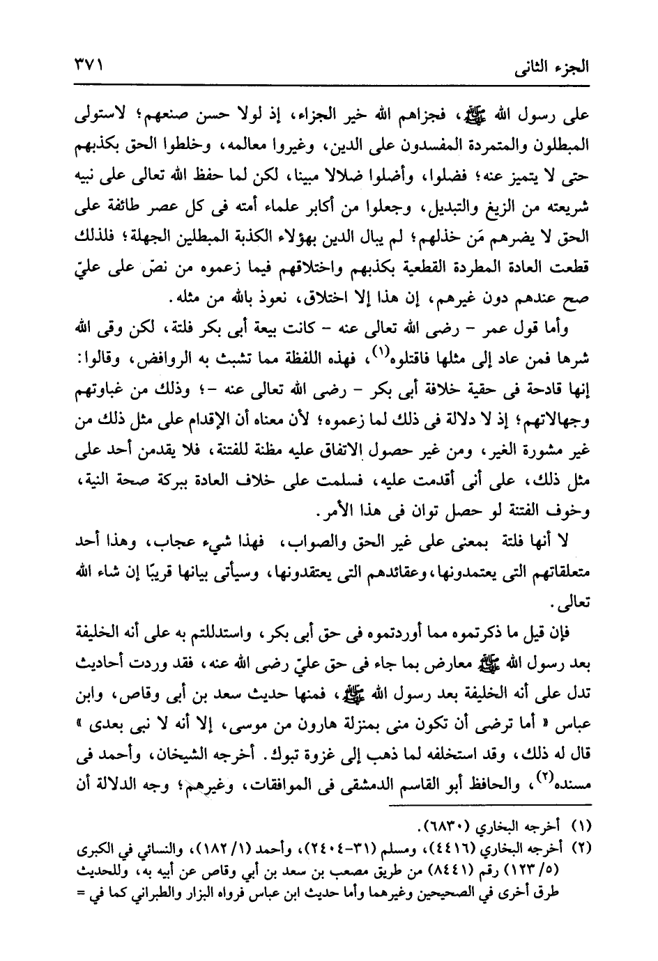 فجزاهم الله خير الْجَزَاء إِذْ لَوْلَا حسن صنعهم لاستولى المبطلون والمتمردة المفسدون على الدّين وغيروا معالمه وخلطوا الْحق بكذبهم حَتَّى لَا يتَمَيَّز عَنهُ فضلوا وأضلوا ضلالا مُبينًا لَكِن لما حفظ الله تَعَالَى على نبيه شَرِيعَته من الزيغ والتبديل وَجعلُوا من أكَابِر عُلَمَاء أمته فِي كل عصر طَائِفَة على الْحق لَا يضرهم مَن خذلهم لم يبال الدّين بهؤلاء الكذبة المبطلين الجهلة فَلذَلِك قطعت الْعَادة المطردة القطيعة بكذبهم واختلاقهم فِيمَا زعموه من نَص على عَليّ صَحَّ عِنْدهم دون غَيرهم إِن هَذَا إِلَّا اخْتِلَاق نَعُوذ بِاللَّه من مثله وَأما قَول عمر رَضِي الله تَعَالَى عَنهُ كَانَت بيعَة أبي بكر فلتة لَكِن وقى الله شَرها فَمن عَاد إِلَى مثلهَا فَاقْتُلُوهُ فَهَذِهِ اللَّفْظَة مِمَّا تشبث بِهِ الروافض وَقَالُوا إِنَّهَا قادحة فِي حقية خلَافَة أبي بكر رَضِي الله تَعَالَى عَنهُ وَذَلِكَ من غباوتهم وجهالاتهم إِذْ لَا دلَالَة فِي ذَلِك لما زعموه لِأَن مَعْنَاهُ أَن الْإِقْدَام على مثل ذَلِك من غير مشورة الْغَيْر وَمن غير حُصُول الِاتِّفَاق عَلَيْهِ مَظَنَّة للفتنة فَلَا يقدمن أحد على مثل ذَلِك على أَنِّي أقدمت عَلَيْهِ فَسلمت على خلاف الْعَادة ببركة صِحَة النِّيَّة وَخَوف الْفِتْنَة لَو حصل توان فِي هَذَا الْأَمر لَا أَنَّهَا فلتة بِمَعْنى على غير الْحق وَالصَّوَاب فَهَذَا شَيْء عُجاب وَهَذَا أحد متعلقاتهم الَّتِي يعتمدونها وعقائدهم الَّتِي يعتقدونها وَسَيَأْتِي بَيَانهَا قَرِيبا إِن شَاءَ الله تَعَالَى فَإِن قيل مَا ذكرتموه مِمَّا أوردتموه فِي حق أبي بكر واستدللتم بِهِ على أَنه الْخَلِيفَة بعد رَسُول الله