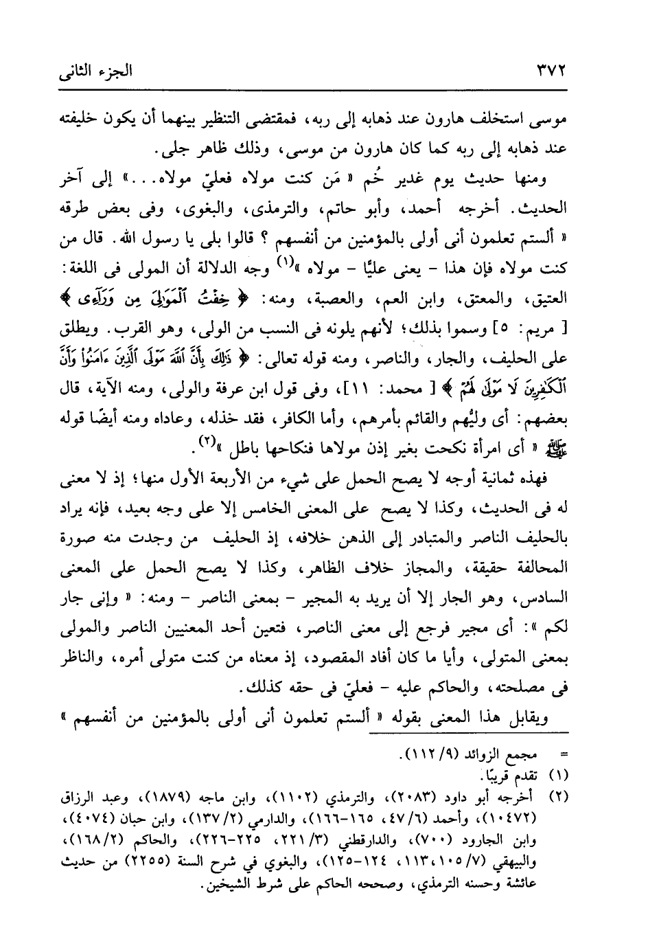 مُوسَى اسْتخْلف هَارُون عِنْد ذَهَابه إِلَى ربه فَمُقْتَضى التنظير بَينهمَا أَن يكون خَلِيفَته عِنْد ذَهَابه إِلَى ربه كَمَا كَانَ هَارُون من مُوسَى وَذَلِكَ ظَاهر جلي وَمِنْهَا حَدِيث يَوْم غَدِير خُم مَن كنت مَوْلَاهُ فعلي مَوْلَاهُ إِلَى آخر الحَدِيث // (أخرجه أَحْمد وَأَبُو حَاتِم وَالتِّرْمِذِيّ وَالْبَغوِيّ) // وَفِي بعض طرقه ألستم تعلمُونَ إِنِّي أولى بِالْمُؤْمِنِينَ من أنفسهم قَالُوا بلَى يَا رَسُول الله قَالَ من كنت مَوْلَاهُ فَإِن هَذَا يَعْنِي عليا مَوْلَاهُ وَجه الدّلَالَة أَن الْمولى فِي اللُّغَة الْعَتِيق وَالْمُعتق وَابْن الْعم والعصبة وَمِنْه {خفت الْمولى من وراءى} مَرْيَم 5 وَسموا بذلك لأَنهم يلونه فِي النّسَب من الْوَلِيّ وَهُوَ الْقرب ويطاق على الحليف وَالْجَار والناصر وَمِنْه قَوْله تَعَالَى {ذَلِك بِأَن الله مولى الَّذين ءامنوا وَأَن الْكَافرين لَا مولى لَهُم} مُحَمَّد 11 وَفِي قَول ابْن عَرَفَة وَالْوَلِيّ وَمِنْه الْآيَة قَالَ بَعضهم أَي وليهم والقائم بأمرهم وَأما الْكَافِر فقد خذله وعاداه وَمِنْه أَيْضا قَوْله