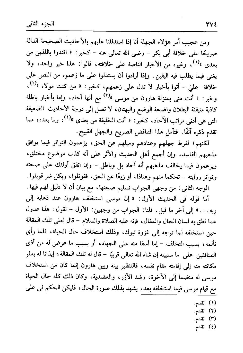 وَمن عَجِيب أَمر هَؤُلَاءِ الجهلة أَنا إِذا استدللنا عَلَيْهِم بالأحاديث الصَّحِيحَة الدَّالَّة صريحَاً على خلَافَة أبي بكر رَضِي الله تَعَالَى عَنهُ كَخَبَر اقتدوا باللذين من بعدِي وَغَيره من الْأَخْبَار الناصة على خِلَافَته قَالُوا هَذَا خبر وَاحِد وَلَا يُغني فِيمَا يطْلب فِيهِ الْيَقِين وَإِذا أَرَادوا أَن يستدلوا على مَا زعموه من النَّص على خلَافَة عَليّ أَتَوا بأخبار لَا تدل على زعمهم كَخَبَر من كنت مَوْلَاهُ وَخبر أَنْت مني بِمَنْزِلَة هَارُون من مُوسَى مَعَ أَنَّهَا آحَاد وَإِمَّا بأخبار بَاطِلَة كَاذِبَة متيقنة الْبطلَان وَاضِحَة الْوَضع والبهتان لَا تصل إِلَى دَرَجَة الْأَحَادِيث الضعيفة الَّتِي هِيَ أدنى مَرَاتِب الْآحَاد كَخَبَر أَنْت الْخَلِيفَة من بعدِي وَمَا بعده مِمَّا تقدم ذكره آنِفا فَتَأمل هَذَا التَّنَاقُض الصَّرِيح وَالْجهل الْقَبِيح لكِنهمْ لفرط جهلهم وعنادهم وميلهم عَن الْحق يَزْعمُونَ التَّوَاتُر فِيمَا يُوَافق مَذْهَبهم الْفَاسِد وَإِن أجمع أهل الحَدِيث والأثر على أَنه كذب مَوْضُوع مختلق ويزعمون فِيمَا يُخَالف مَذْهَبهم أَنه آحَاد بل وباطل وَإِن اتّفق أُولَئِكَ على صِحَّته وتواتر رِوَايَته تحكماً مِنْهُم وعناداً أَو زيغاً عَن الْحق فقوتلوا وَبِكُل شَرّ قوبلوا الْوَجْه الثَّانِي من وَجْهي الْجَواب تَسْلِيم صِحَّتهَا مَعَ بَيَان أَن لَا دَلِيل لَهُم فِيهَا أما قَوْله فِي الحَدِيث الأول إِن مُوسَى اسْتخْلف هَارُون عِنْد ذَهَابه إِلَى ربه إِلَى آخر مَا قيل قُلْنَا الْجَواب من وَجْهَيْن الأول نقُول هَذَا عدُول عَمَّا نطق بِهِ لِسَان الْحَال والمقال فَإِنَّهُ عَلَيْهِ الصَّلَاة وَالسَّلَام قَالَ لعلى تِلْكَ الْمقَالة حِين اسْتَخْلَفَهُ لما توجه إِلَى غَزْوَة تَبُوك وَذَلِكَ اسْتِخْلَاف حَال الْحَيَاة فَلَمَّا رأى تألمه بِسَبَب التَّخَلُّف إِمَّا أسفا مِنْهُ على الْجِهَاد أَو بِسَبَب مَا عرض لَهُ من أَذَى الْمُنَافِقين على مَا سنبينه إِن شَاءَ الله تَعَالَى قَرِيبا قَالَ لَهُ تِلْكَ الْمقَالة إِيذَانًا لَهُ بعلو مكانته مِنْهُ إِلَى إِقَامَته مقَام نَفسه فالتنظير بَينه وَبَين هَارُون إِنَّمَا كَانَ من اسْتِخْلَاف مُوسَى لَهُ مُنْضَمًّا إِلَى الْأُخوة وَشد الأزر والعضدية وَكَانَ ذَلِك كُله حَال الْحَيَاة مَعَ قيام مُوسَى فِيمَا اسْتَخْلَفَهُ بعد يشْهد بذلك صُورَة الْحَال فَلْيَكُن الحكم فِي عَليّ