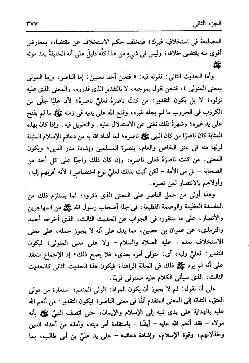 وَأما الحَدِيث الثَّانِي فَقَوله فِيهِ فَتعين أحد مَعْنيين إِمَّا النَّاصِر وَإِمَّا الْمولى بِمَعْنى الْمُتَوَلِي فَنحْن نقُول بِمُوجبِه لَا بالتقدير الَّذِي قدروه وَالْمعْنَى الَّذِي عَلَيْهِ نزلوه لَا بل يكون التَّقْدِير من كنتُ ناصرَهُ فعلي ناصرهُ لِأَن عليا جلَّى من الكروب فِي الحروب مَا لم يجله غَيره وَفتح الله على يَدَيْهِ فِي زَمَنه