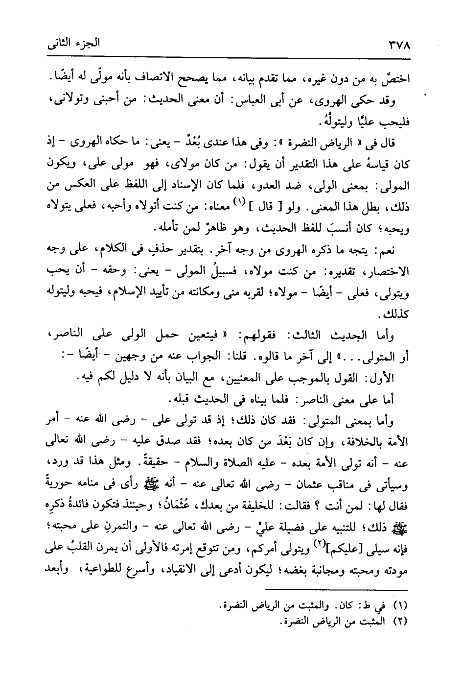 اخْتصَّ بِهِ من دون غَيره مِمَّا تقدم بَيَانه مِمَّا يصحح الاتصاف بِأَنَّهُ مولى لَهُ أَيْضا وَقد حكى الْهَرَوِيّ عَن أبي الْعَبَّاس أَن معنى الحَدِيث من أَحبَّنِي وتولاني فليحب عليا وليتولهُ قَالَ فِي الرياض النضرة وَفِي هَذَا عِنْدِي بُعدْ يَعْنِي مَا حَكَاهُ الْهَرَوِيّ إِذْ كَانَ قياسهُ على هَذَا التَّقْدِير أَن يَقُول من كَانَ مولَايَ فَهُوَ مولى عَليّ وَيكون الْمولى بِمَعْنى الْوَلِيّ ضد الْعَدو فَلَمَّا كَانَ الْإِسْنَاد إِلَى اللَّفْظ على الْعَكْس من ذَلِك بَطل هَذَا الْمَعْنى وَلَو قَالَ مَعْنَاهُ من كنت أتولاه وأحبه فعلي يَتَوَلَّاهُ وَيُحِبهُ كَانَ أنسبَ للفظ الحَدِيث وَهُوَ ظَاهر لمن تَأمله نعم يتَّجه مَا ذكره الْهَرَوِيّ من وَجه آخر بِتَقْدِير حذفٍ فِي الْكَلَام على وَجه الِاخْتِصَار تَقْدِيره من كنت مَوْلَاهُ فسبيلُ الْمولى يَعْنِي وَحقه أَن يحب ويتولى فعلي أَيْضا مَوْلَاهُ لقُرْبه مني ومكانته من تأييد الْإِسْلَام فَيُحِبهُ وليتوله كَذَلِك وَأما الحَدِيث الثَّالِث فَقَوْلهم فَيتَعَيَّن حمل الْوَلِيّ على النَّاصِر أَو الْمُتَوَلِي ... إِلَى آخر مَا قَالُوهُ قُلْنَا الْجَواب عَنهُ من وَجْهَيْن أَيْضا الأول القَوْل بِالْمُوجبِ على الْمَعْنيين مَعَ الْبَيَان بِأَنَّهُ لَا دَلِيل لكم فِيهِ أما على معنى النَّاصِر فَلَمَّا بَيناهُ فِي الحَدِيث قبله وَأما بِمَعْنى الْمُتَوَلِي فقد كَانَ ذَلِك إِذْ قد تولى عَليّ رَضِي الله عَنهُ أَمر الْأمة بالخلافة وَإِن كَانَ بعده من كَانَ بعده فقد صدق عَلَيْهِ رَضِي الله تَعَالَى عَنهُ أَنه تولى الْأمة بعده عَلَيْهِ الصَّلَاة وَالسَّلَام حَقِيقَة وَمثل هَذَا قد ورد وَسَيَأْتِي فِي مَنَاقِب عُثْمَان رَضِي الله تَعَالَى عَنهُ أَنه النَّبِي