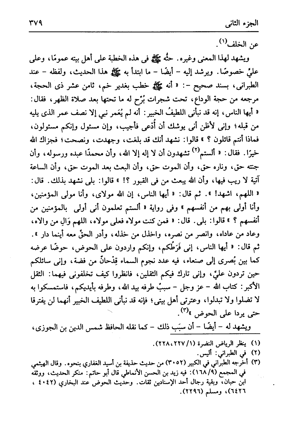 خطب بغدير خم ثامن عشر ذِي الْحجَّة مرجعه من حجَّة الْوَدَاع تَحت شجرات بُرِّح لَهُ مَا تحتهَا بعد صَلَاة الظّهْر فَقَالَ أَيهَا النَّاس إِنَّه قد نَبَّأَنِي اللطيفُ الْخَبِير أَنه لم يُعَمر نَبِي إِلَّا نصف عمر الَّذِي يَلِيهِ من قبله وَإِنِّي لأَظُن أَنِّي يُوشك أَن أدعى فَأُجِيب وَإِن مستول وَإِنَّكُمْ مسؤولون فَمَاذَا أَنْتُم قَائِلُونَ قَالُوا نشْهد أَنَّك قد بلغت وجهدت وَنَصَحْت فجزاك الله خيرا فَقَالَ ألستم تَشْهَدُون أَن لَا إِلَه إِلَّا الله وَأَن مُحَمَّدًا عَبده وَرَسُوله وَأَن جنته حق وناره حق وَأَن الْمَوْت حق وَأَن الْبَعْث بعد الْمَوْت حق وَأَن السَّاعَة آتِيَة لَا ريب فِيهَا وَأَن الله يبْعَث من فِي الْقُبُور قَالُوا بلَى نشْهد بذلك قَالَ اللَّهُمَّ أشهد ثمَّ قَالَ أَيهَا النَّاس إِن الله مولَايَ وَأَنا مولى الْمُؤمنِينَ وَأَنا أولى بهم من أنفسهم وَفِي رِوَايَة ألستم تعلمُونَ أَنِّي أولى بِالْمُؤْمِنِينَ من أنفسهم قَالُوا بلَى قَالَ فَمن كنت مَوْلَاهُ فعلي مَوْلَاهُ اللَّهُمَّ وَالِ من وَالَاهُ وَعَاد من عَادَاهُ وانصر من نَصره واخذل من خذله وأدر الْحق مَعَه أَيْنَمَا دَار ثمَّ قَالَ أَيهَا النَّاس إِنِّي فَرَطُكم وَإِنَّكُمْ وَارِدُونَ على الْحَوْض حوضاً عرضه كَمَا بَين بُصرى إِلَى صنعاء فِيهِ عدد نُجُوم السَّمَاء قِدحانٌ من فضَّة وَإِنِّي سَائِلكُمْ حِين تردون عَليّ وَإِنِّي تَارِك فِيكُم الثقلَيْن فانظروا كَيفَ تخلفوني فيهمَا الثّقل الْأَكْبَر كتاب الله عز وَجل سببٌ طرفه بيد الله وطرفه بِأَيْدِيكُمْ فاستمسكوا بِهِ لَا تضلوا وَلَا تبدلوا وعترتى أهل بَيْتِي فَإِنَّهُ قد نَبَّأَنِي اللَّطِيف الْخَبِير أَنَّهُمَا لن يفترقا حَتَّى يردا على الْحَوْض وَيشْهد لَهُ أَيْضا أَن سبَب ذَلِك كَمَا نَقله الْحَافِظ شمس الدّين بن الْجَوْزِيّ