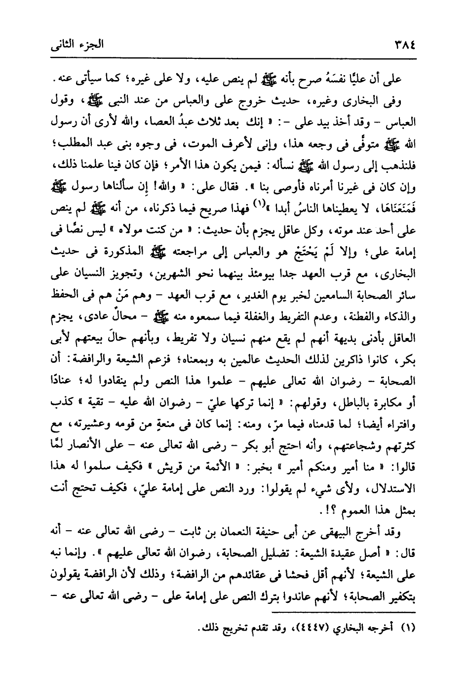 محَال عادي يجْزم الْعَاقِل بِأَدْنَى بديهة أَنهم لم يَقع مِنْهُم نِسْيَان وَلَا تَفْرِيط وبأنهم حالَ بيعتهم لأبي بكر كَانُوا ذاكرين لذَلِك الحَدِيث عَالمين بِهِ وَبِمَعْنَاهُ فَزعم الشِّيعَة والرافضة أَن الصَّحَابَة رضوَان الله تَعَالَى عَلَيْهِم علمُوا هَذَا النَّص وَلم ينقادوا لَهُ عناداً أَو مُكَابَرَة بِالْبَاطِلِ وَقَوْلهمْ إِنَّمَا تَركهَا عَليّ رضوَان الله عَلَيْهِ تقية كذب وافتراء أَيْضا لما قدمْنَاهُ فِيمَا مر وَمِنْه إِنَّمَا كَانَ فِي مَنْعَة من قومه وعشيرته مَعَ كثرتهم وشجاعتهم وَأَنه احْتج أَبُو بكر رَضِي الله تَعَالَى عَنهُ على الْأَنْصَار لما قَالُوا منا أَمِير ومنكم أَمِير بِخَبَر الْأَئِمَّة من قُرَيْش فَكيف سلمُوا لَهُ هَذَا الِاسْتِدْلَال ولأي شَيْء لم يَقُولُوا ورد النَّص على إِمَامَة عَليّ فَكيف تحتج أَنْت بِمثل هَذَا الْعُمُوم وَقد أخرج الْبَيْهَقِيّ عَن أبي حنيفَة النُّعْمَان بن ثَابت رَضِي الله تَعَالَى عَنهُ أَنه قَالَ أصل عقيدة الشِّيعَة تضليل الصَّحَابَة رضوَان الله تَعَالَى عَلَيْهِم وَإِنَّمَا نبه عَليّ الشِّيعَة لأَنهم أقل فحشاً فِي عقائدهم من الرافضة وَذَلِكَ لِأَن الرافضة يَقُولُونَ بتكفير الصَّحَابَة لأَنهم عاندوا بترك النَّص على إِمَامَة عَليّ رَضِي الله تَعَالَى عَنهُ