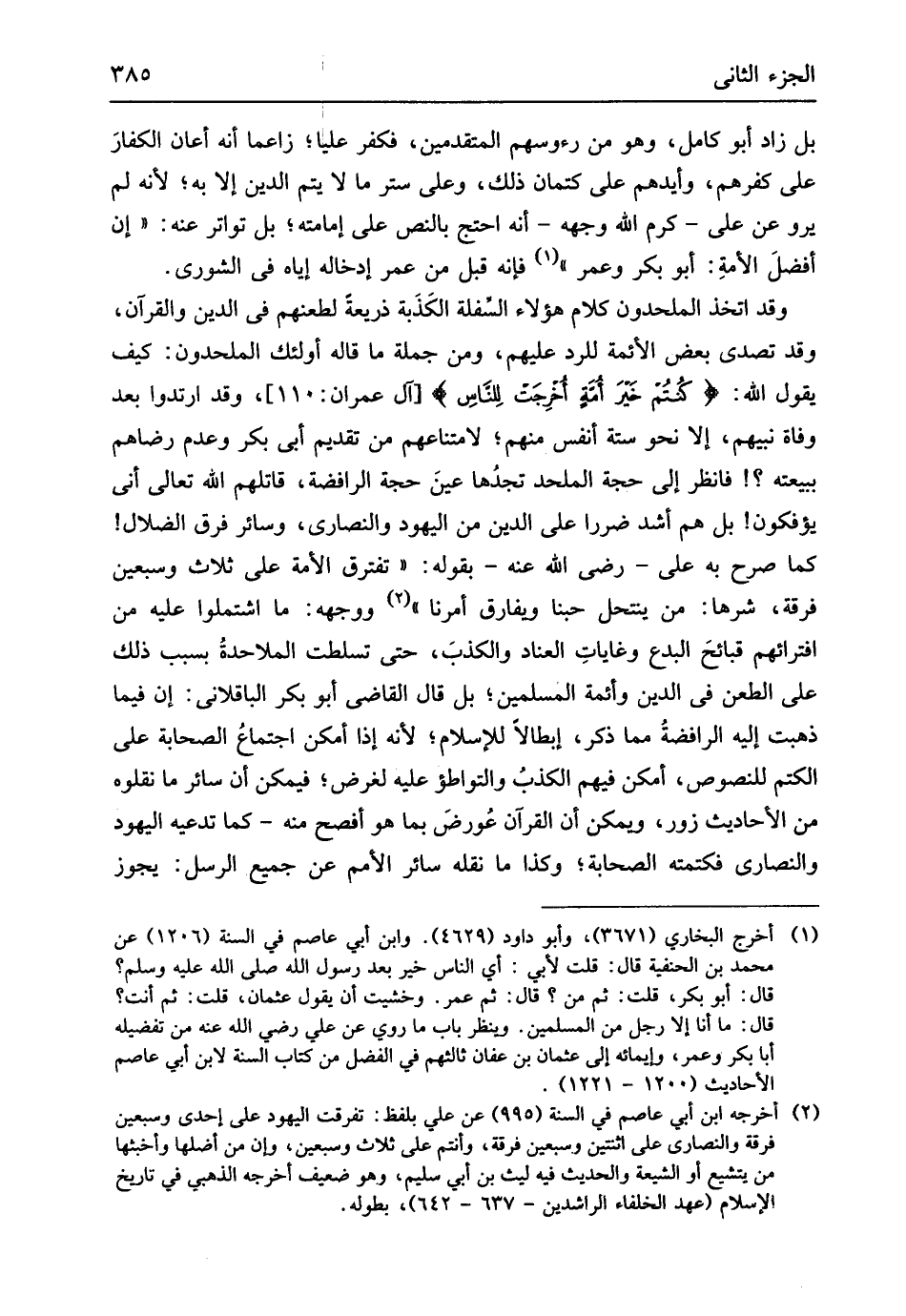 بل زَاد أَبُو كَامِل وَهُوَ من رؤوسهم الْمُتَقَدِّمين فَكفر عليا زاعما أَنه أعَان الكفارَ على كفرهم وأيدهم على كتمان ذَلِك وعَلى ستر مَا لَا يتم الدّين إِلَّا بِهِ لِأَنَّهُ لم يرو عَن عَليّ كرم الله وَجهه أَنه احْتج بِالنَّصِّ على إِمَامَته بل تَوَاتر عَنهُ إِن أفضلَ الْأمة أَبُو بكر وَعمر فَإِنَّهُ قبل من عمر إِدْخَاله إِيَّاه فِي الشورى وَقد اتخذ الْمُلْحِدُونَ كَلَام هَؤُلَاءِ السفلة الكَذَبة ذَرِيعَة لطعنهم فِي الدّين وَالْقُرْآن وَقد تصدى بعض الْأَئِمَّة للرَّدّ عَلَيْهِم وَمن جملَة مَا قَالَه أُولَئِكَ الْمُلْحِدُونَ كَيفَ يَقُول الله {كنُتُم خيرَ أُمةٍ أُخرِجَت لِلناسِ} آل عمرَان 110 وَقد ارْتَدُّوا بعد وَفَاة نَبِيّهم إِلَّا نَحْو سِتَّة أنفس مِنْهُم لامتناعهم من تَقْدِيم أبي بكر وَعدم رضاهم ببيعته فَانْظُر إِلَى حجَّة الملحد تجدها عينَ حجَّة الرافضة قَاتلهم الله تَعَالَى أَنِّي يؤفكون بل هم أَشد ضَرَرا على الدّين من الْيَهُود وَالنَّصَارَى وَسَائِر فرق الضلال كَمَا صرح بِهِ عَليّ رَضِي الله عَنهُ بقوله تفترق الْأمة على ثَلَاث وَسبعين فرقة شَرها من ينتحل حبنا وَيُفَارق أمرنَا وَوَجهه مَا اشتملوا عَلَيْهِ من افترائهم قبائحَ الْبدع وغاياتِ العناد والكذبَ حَتَّى تسلطت الملاحدةُ بِسَبَب ذَلِك على الطعْن فِي الدّين وأئمة الْمُسلمين بل قَالَ القاضى أَبُو بكر الباقلاني إِن فِيمَا ذهبت إِلَيْهِ الرافضةُ مِمَّا ذكر إبطالاً لِلْإِسْلَامِ لِأَنَّهُ إِذا أمكن اجتماعُ الصَّحَابَة على الكتم للنصوص أمكن فيهم الكذبُ والتواطؤ عَلَيْهِ لغَرَض فَيمكن أَن سَائِر مَا نقلوه من الْأَحَادِيث زور وَيُمكن أَن الْقُرْآن عُورضَ بِمَا هُوَ أفْصح مِنْهُ كَمَا تدعيه الْيَهُود وَالنَّصَارَى فكتمته الصَّحَابَة وَكَذَا مَا نَقله سَائِر الْأُمَم عَن جَمِيع الرُّسُل يجوز
