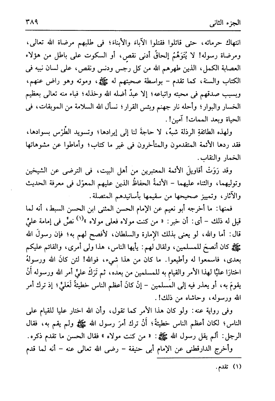 وَمَوته وَهُوَ رَاض عَنْهُم وبسبب صدقهم فِي محبته واتباعه إِلَّا عبد أضلّهُ الله وخذله فباء مِنْهُ تَعَالَى بعظيم الخسار والبوار وأحله نَار جَهَنَّم وَبئسَ الْقَرار نسْأَل الله السَّلامَة من الموبقات فِي الْحَيَاة وَبعد الْمَمَات آمين ولهذه الطائفةِ الرذلة شبه لَا حاجةَ لنا إِلَى إيرادها وتسويد الطِّرْس بسوادها فقد ردهَا الْأَئِمَّة المتقدمون والمتأخرون فِي غير مَا كتاب وأماطوا عَن مشوهاتها الْخمار والنقاب وَقد رَوَتْ أقاويلَ الْأَئِمَّة المعتبرين من أهل الْبَيْت فِي الترضي عَن الشَّيْخَيْنِ وتوليهما وَالثنَاء عَلَيْهِمَا الأئمةُ الحفاظُ الَّذين عَلَيْهِم المعوّل فِي معرفَة الحَدِيث والْآثَار وتمييز صحيحها من سقيمها بأسانيدهم الْمُتَّصِلَة فَمِنْهَا مَا أخرجه أَبُو نعيم عَن الإِمَام الْحسن الْمثنى ابْن الْحسن السبط أَنه لما قيل لَهُ ذَلِك أَي أَن خبر من كنت مَوْلَاهُ فعلي مَوْلَاهُ نصُّ فِي إِمَامَة عليِّ قَالَ أما وَالله لَو يَعْنِي بذلك الإِمارة وَالسُّلْطَان لأفصح لَهُم بِهِ فَإِن رَسُول الله