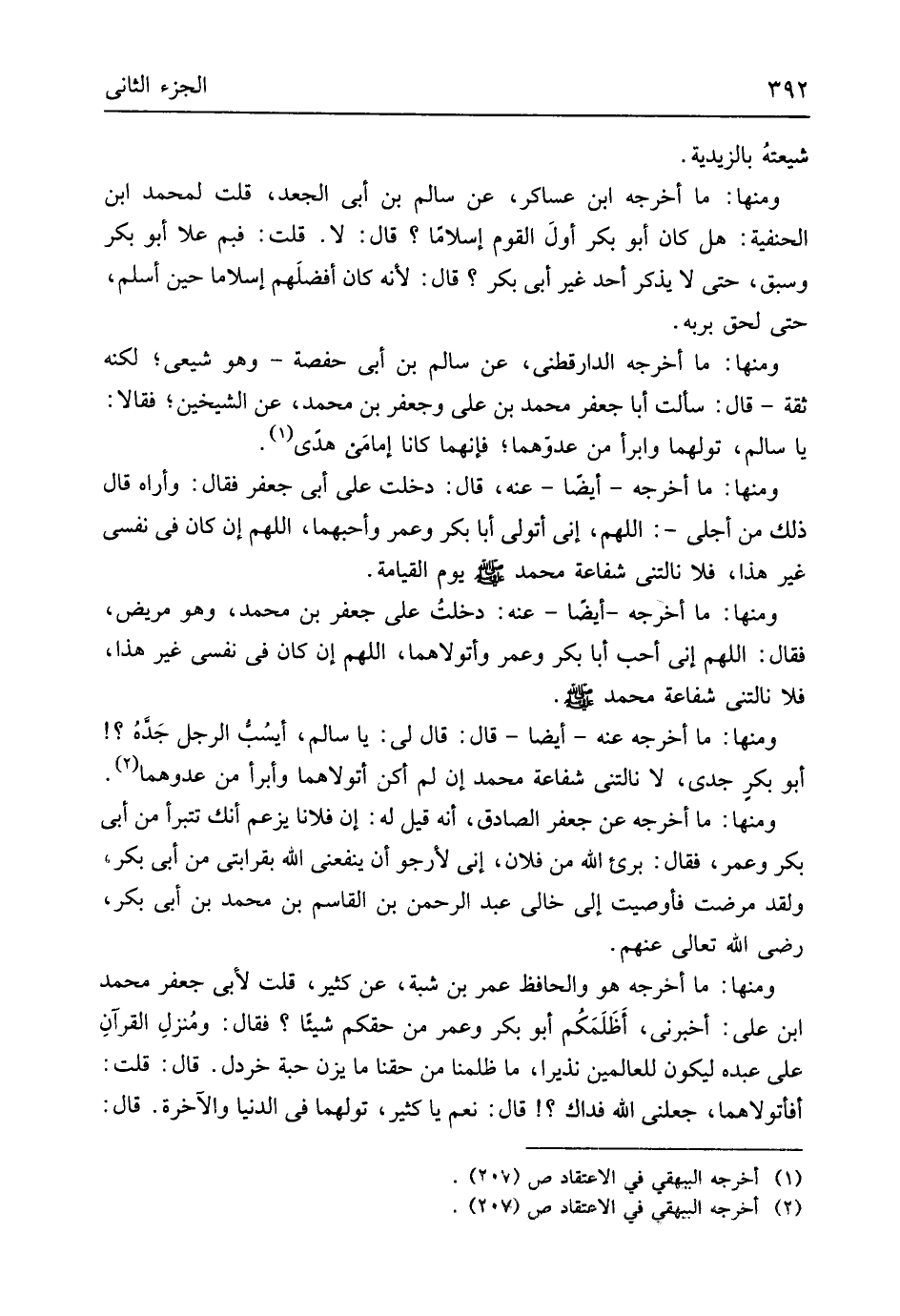 وَمِنْهَا مَا أخرجه عَنهُ أَيْضا قَالَ قَالَ لي يَا سَالم أيسب الرجل جَدَهُ أَبُو بكرٍ جدي لَا نالتني شَفَاعَة مُحَمَّد إِن لم أكن أتولاهما وَأَبْرَأ من عدوهما وَمِنْهَا مَا أخرجه عَن جَعْفَر الصَّادِق أَنه قيل لَهُ إِن فلَانا يزْعم أَنَّك تتبرأ من أَبى بكر وَعمر فَقَالَ برىء الله من فلَان إِنِّي لأرجو أَن يَنْفَعنِي الله بِقَرَابَتِي من أبي بكر وَلَقَد مَرضت فأوصيت إِلَى خَالِي عبد الرَّحْمَن بن الْقَاسِم بن مُحَمَّد بن أبي بكر رَضِي الله تَعَالَى عَنْهُم وَمِنْهَا مَا أخرجه هُوَ والحافظ عمر بن شبة عَن كثير قلت لأبى جَعْفَر وَمُحَمّد ابْن عَليّ أَخْبرنِي أظَلَمَكم أَبُو بكر وَعمر من حقكم شَيْئا فَقَالَ ومُنزلِ القرآنِ على عَبده ليَكُون للْعَالمين نذيراً مَا ظلمنَا من حَقنا مَا يزن حَبَّة خَرْدَل قَالَ قلت أفأتولاهما جعلني الله فدَاك قَالَ نعم يَا كثير تولهما فِي الدُّنْيَا وَالْآخِرَة قَالَ