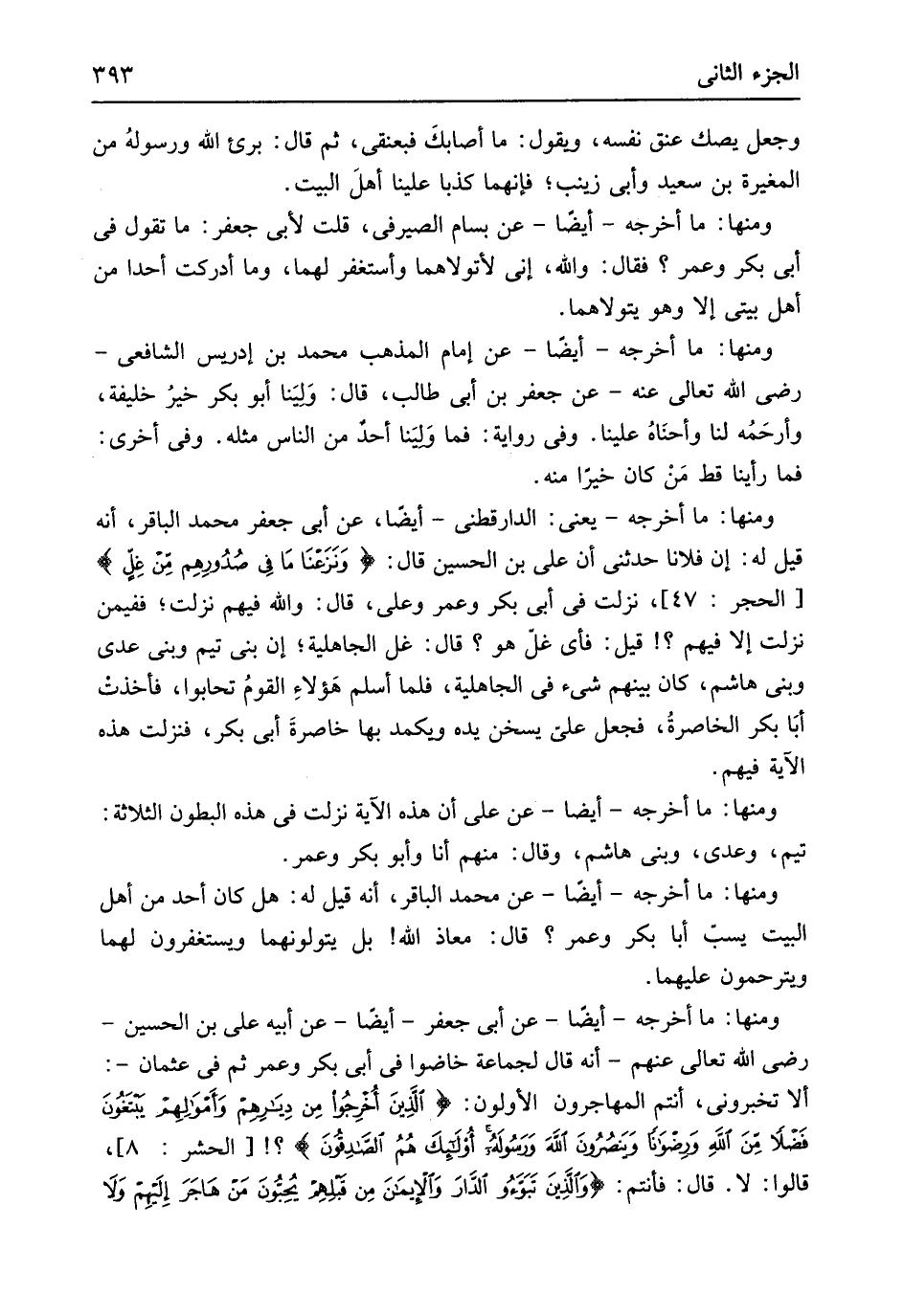 وَجعل يصك عنق نَفسه وَيَقُول مَا أصابكَ فبعنقي ثمَّ قَالَ برىء الله ورسولهُ من الْمُغيرَة بن سعيد وَأبي زَيْنَب فَإِنَّهُمَا كذبا علينا أهلَ الْبَيْت وَمِنْهَا مَا أخرجه أَيْضا عَن بسام الصَّيْرَفِي قلت لأبي جَعْفَر مَا تَقول فِي أبي بكر وَعمر فَقَالَ وَالله إِنِّي لأتولاهما وَأَسْتَغْفِر لَهما وَمَا أدْركْت أحدا من أهل بَيْتِي إِلَّا وَهُوَ يتولاهما وَمِنْهَا مَا أخرجه أَيْضا عَن إِمَام الْمَذْهَب مُحَمَّد بن إِدْرِيس الشَّافِعِي رَضِي الله تَعَالَى عَنهُ عَن جَعْفَر بن أبي طَالب قَالَ وَليَنا أَبُو بكر خيرُ خَليفَة وأرحَمُه لنا وأحنَاهُ علينا وَفِي رِوَايَة فَمَا وَليَنا أحد من النَّاس مثله وَفِي أُخْرَى فَمَا رَأينَا قطّ مَنْ كَانَ خيرَاً مِنْهُ وَمِنْهَا مَا أخرجه يَعْنِي الدَّارَقُطْنِيّ أَيْضا عَن أبي جَعْفَر مُحَمَّد الباقر أَنه قيل لَهُ إِن فلَانا حَدثنِي أَن عَليّ بن الْحُسَيْن قَالَ {وَنَزَعْنَا مَا فِي صدروهم مِّن غِلٍّ} الْحجر 47 نزلت فِي أبي بكر وَعمر وَعلي قَالَ وَالله فيهم نزلت ففيمن نزلت إِلَّا فيهم قيل فَأَي غل هُوَ قَالَ غل الْجَاهِلِيَّة إِن بني تيم وَبني عدي وَبني هَاشم كَانَ بَينهم شَيْء فِي الْجَاهِلِيَّة فَلَمَّا أسلم هَؤلاءِ القومُ تحَابوا فأخذتْ أبَا بكر الخاصرةُ فَجعل عَليّ يسخن يَده ويكمد بهَا خاصرةَ أبي بكر فَنزلت هَذِه الْآيَة فيهم وَمِنْهَا مَا أخرجه أَيْضا عَن على أَن هَذِه الْآيَة نزلت فِي هَذِه الْبُطُون الثَّلَاثَة تيم وعدي وَبني هَاشم وَقَالَ مِنْهُم أَنا وَأَبُو بكر وَعمر وَمِنْهَا مَا أخرجه أَيْضا عَن مُحَمَّد الباقر وَأَنه قيل لَهُ هَل كَانَ أحد من أهل الْبَيْت يسب أَبَا بكر وَعمر قَالَ معَاذ الله بل يتولونهما وَيَسْتَغْفِرُونَ لَهما وَيَتَرَحَّمُونَ عَلَيْهِمَا وَمِنْهَا مَا أخرجه أَيْضا عَن أبي جَعْفَر أَيْضا عَن أَبِيه عَليّ بن الْحُسَيْن رَضِي الله تَعَالَى عَنْهُم أَنه قَالَ لجَماعَة خَاضُوا فِي أبي بكر وَعمر ثمَّ فِي عُثْمَان أَلا تخبروني أَنْتُم الْمُهَاجِرُونَ الْأَولونَ {الذِينَ أُخْرِجُوأ مِن دِياَرِهِم وَأموَالِهِم يبتَغُونَ فَضلاً مِّنَ اللهِ ورضوانا وينصرون الله وَرَسُوله أُولَئِكَ هُمُ الصّاَدِقوُنَ} الْحَشْر 8 قَالُوا لَا / قَالَ فَأنْتم (وَالَّذين تبوءو الدَّارَ وَالإيمانَ مِن قبلِهم يحبِونَ مَن هَاجَرَ إِلَيْهِم وَلَا
