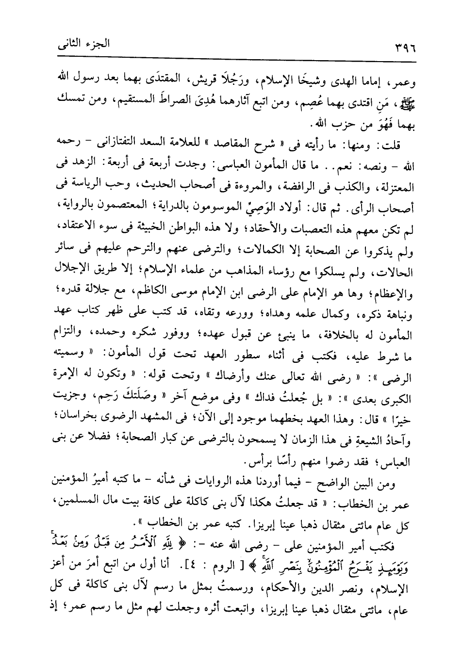 مَنِ اقْتدى بهما عُصِم وَمن اتبع آثارهما هُدِيَ الصراطَ الْمُسْتَقيم وَمن تمسك بهما فَهُوَ من حزب الله قلت وَمِنْهَا مَا رَأَيْته فِي شرح الْمَقَاصِد للعلامة السعد التَّفْتَازَانِيّ رَحمَه الله وَنَصه نعم مَا قَالَ الْمَأْمُون العباسي وجدت أَرْبَعَة فِي أَرْبَعَة الزّهْد فِي الْمُعْتَزلَة وَالْكذب فِي الرافضة والمروءة فِي أَصْحَاب الحَدِيث وَحب الرياسة فِي أَصْحَاب الرَّأْي ثمَّ قَالَ أَوْلَاد الوَصيً الموسومون بالدراية المعتصمون بالرواية لم تكن مَعَهم هَذِه التعصبات والأحقاد وَلَا هَذِه البواطن الخبيثة فِي سوء الِاعْتِقَاد وَلم يذكرُوا عَن الصَّحَابَة إِلَّا الكمالات والترضي عَنْهُم والترحم عَلَيْهِم فِي سَائِر الْحَالَات وَلم يسلكوا مَعَ رُؤَسَاء الْمذَاهب من عُلَمَاء الْإِسْلَام إِلَّا طَرِيق الإجلال والإعظام وَهَا هُوَ الإِمَام عَليّ الرضي ابْن الإِمَام مُوسَى الكاظم مَعَ جلالة قدره ونباهة ذكره وَكَمَال علمه وهداه وورعه وتقاه قد كتب على ظهر كتاب عهد الْمَأْمُون لَهُ بالخلافة مَا يُنبئ عَن قبُول عَهده ووفور شكره وحمده والتزام مَا شَرط عَلَيْهِ فَكتب فِي أثْنَاء سطور الْعَهْد تَحت قَول الْمَأْمُون وسميته الرضي رَضِي الله تَعَالَى عَنْك وأرضاك وَتَحْت قَوْله وَتَكون لَهُ الإمرة الْكُبْرَى بعدِي بل جُعلتُ فدَاك وَفِي مَوضِع آخر وصلتك رحم وجزيت خيرا قَالَ وَهَذَا الْعَهْد بخطهما مَوْجُود إِلَى الْآن فِي المشهد الرضوي بخراسان وآحادُ الشيعةِ فِي هَذَا الزَّمَان لَا يسمحون بالترضي عَن كبار الصَّحَابَة فضلا عَن بني الْعَبَّاس فقد رَضوا مِنْهُم رَأْسا بِرَأْس وَمن الْبَين الْوَاضِح فِيمَا أوردنا هَذِه الرِّوَايَات فِي شَأْنه مَا كتبه أميرُ الْمُؤمنِينَ عمر بن الْخطاب قد جعلتُ هَكَذَا لآل بني كاكلة على كَافَّة بَيت مَال الْمُسلمين كل عَام مِائَتي مِثْقَال ذَهَبا عينا إبريزاً كتبه عمر بن الْخطاب فَكتب أَمِير الْمُؤمنِينَ عَليّ رَضِي الله عَنهُ {للهِ الْأَمر من قبل وَمن بعد ويَومَئِذٍ يفرح المُؤمنونَ بِنَصر الله} الرّوم 4 أَنا أول من اتبع أمرَ من أعز الْإِسْلَام وَنصر الدّين وَالْأَحْكَام ورسمتُ بِمثل مَا رسم لآل بني كاكلة فِي كل عَام مِائَتي مِثْقَال ذَهَبا عينا إبريزا واتبعث أَثَره وَجعلت لَهُم مثل مَا رسم عمر إِذْ