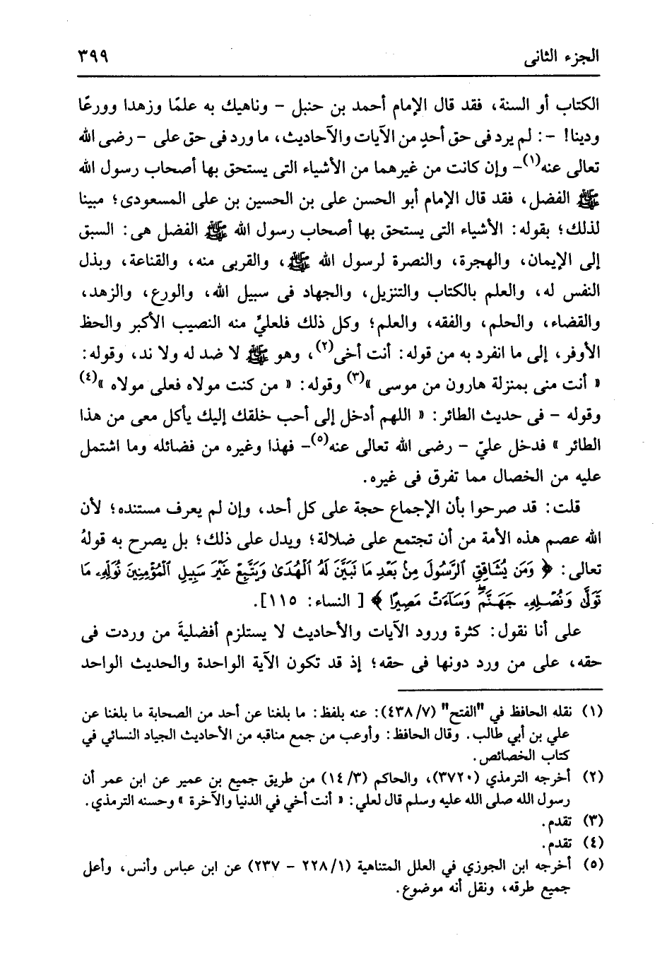 لَا ضد لَهُ وَلَا ند وَقَوله أَنْت مني بِمَنْزِلَة هَارُون من مُوسَى وَقَوله من كنت مَوْلَاهُ فعلي مَوْلَاهُ وَقَوله فِي حَدِيث الطَّائِر اللَّهُمَّ أَدخل إِلَيّ أحب خلقك إِلَيْك يَأْكُل معي من هَذَا الطَّائِر فَدخل عَليّ رَضِي الله تَعَالَى عَنهُ فَهَذَا وَغَيره من فضائله وَمَا اشْتَمَل عَلَيْهِ من الْخِصَال مِمَّا تفرق فِي غَيره قلت قد صَرَّحُوا بِأَن الْإِجْمَاع حجَّة على كل أحد وَإِن لم يعرف مُسْتَنده لِأَن الله عصم هَذِه الْأمة من أَن تَجْتَمِع على ضَلَالَة وَيدل على ذَلِك بل يُصَرح بِهِ قولهُ تَعَالَى {وَمَن يشاقِقِ الرَسُولَ مِن بَعدِ مَا تَبَين لَهُ الهُدَى وَيَتبع غيرَ سَبِيلِ المُؤمنِينَ نوله مَا تولى ونصله جَهَنَّم وسَاءَت مَصِيراً} النِّسَاء 115 على أَنا نقُول كَثْرَة وُرُود الْآيَات وَالْأَحَادِيث لَا يسْتَلْزم أفضليةَ من وَردت فِي حَقه على من ورد دونهَا فِي حَقه إِذْ قد تكون الْآيَة الْوَاحِدَة والْحَدِيث الْوَاحِد