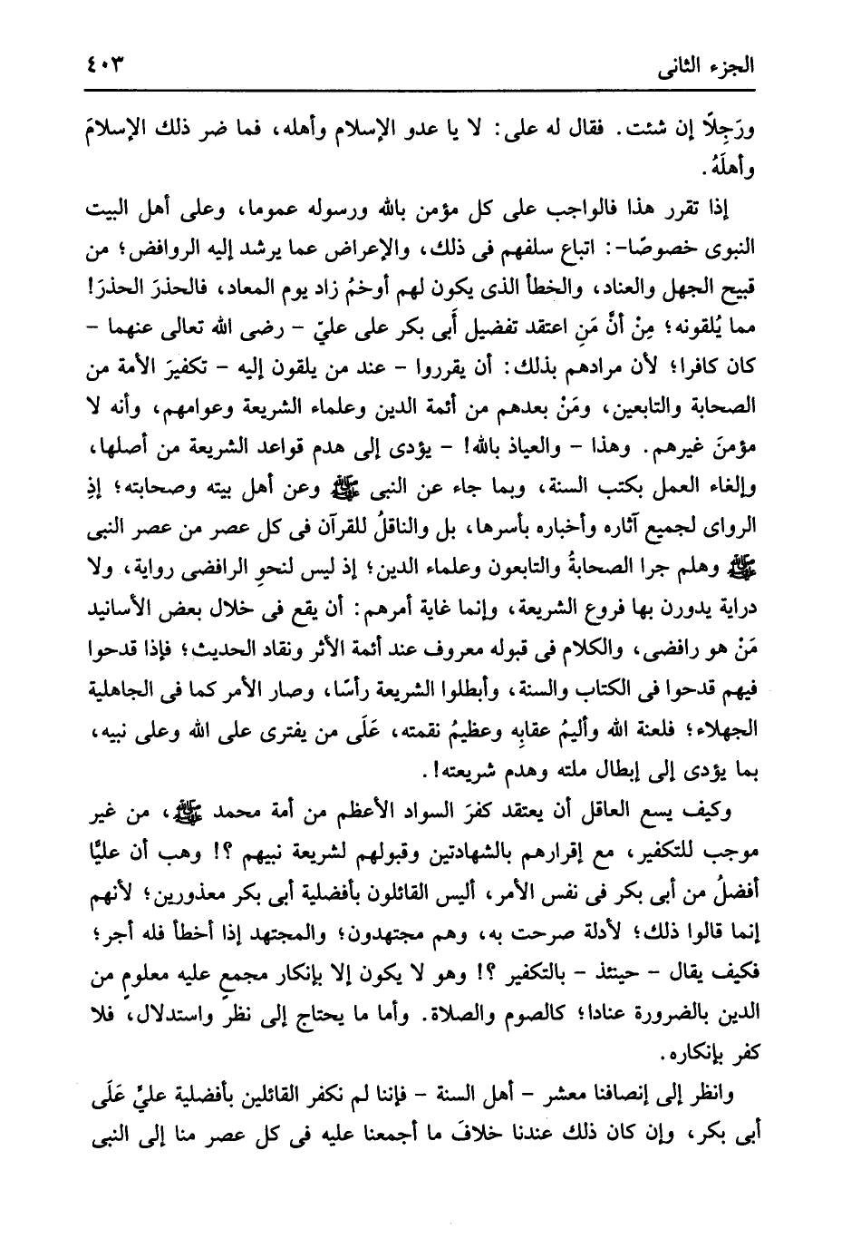 وهلم جرا الصحابةُ والتابعون وعلماء الدّين إِذْ لَيْسَ لنحوِ الرافضي رِوَايَة وَلَا دراية يدورن بهَا فروع الشَّرِيعَة وَإِنَّمَا غَايَة أَمرهم أَن يَقع فِي خلال بعض الْأَسَانِيد من هُوَ رَافِضِي وَالْكَلَام فِي قبُوله مَعْرُوف عِنْد أَئِمَّة الْأَثر ونقاد الحَدِيث فَإِذا قَدَحُوا فيهم قَدَحُوا فِي الْكتاب وَالسّنة وأبطلوا الشَّرِيعَة رَأْسا وَصَارَ الْأَمر كَمَا فِي الْجَاهِلِيَّة الجهلاء فلعنة الله وأليمُ عقابِه وعظيمُ نقمته عَلَى من يفتري على الله وعَلى نبيه بِمَا يُؤَدِّي إِلَى إبِْطَال مِلَّته وَهدم شَرِيعَته وَكَيف يسع الْعَاقِل أَن يعْتَقد كفرَ السوَاد الْأَعْظَم من أمة مُحَمَّد