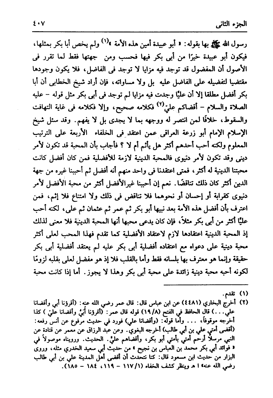 بهَا بقوله أَبُو عُبَيْدَة أَمِين هَذِه الْأمة وَلم يخص أَبَا بكر بِمِثْلِهَا فَيكون أَبُو عُبَيْدَة خيرا من أبي بكر فِيهَا فَحسب وَمن جِهَتهَا فَقَط لما تقرر فِي الْأُصُول أَن الْمَفْضُول قد تُوجد فِيهِ مزايا لَا تُوجد فِي الْفَاضِل فَلَا يكون وجودهَا مقتضياً لتفضيله على الْفَاضِل عَلَيْهِ بل وَلَا مساواته فَإِن أَرَادَ شيخ الْخطابِيّ أَن أَبَا بكر أفضل مُطلقًا إِلَّا أَن عليا وجدت فِيهِ مزايا لم تُوجد فِي أبي بكر مثل قَوْله عَلَيْهِ الصَّلَاة وَالسَّلَام أقضاكم عَليّ فَكَلَامه صَحِيح وَإِلَّا فَكَلَامه فِي غَايَة التهافت والسقوط خلافًا لمن انتصر لَهُ وَوَجهه بِمَا لَا يجدي بل لَا يفهم وَقد سُئِلَ شيخ الْإِسْلَام الإِمَام أَبُو زرْعَة الْعِرَاقِيّ عَمَّن اعتقدِ فِي الْخُلَفَاء الْأَرْبَعَة على التَّرْتِيب الْمَعْلُوم وَلكنه أحب أحدهم أَكثر هَل يَأْثَم أم لَا فَأجَاب بِأَن الْمحبَّة قد تكون لأمر ديني وَقد تكون لأمر دُنْيَوِيّ فالمحبة الدِّينِيَّة لَازِمَة للأفضلية فَمن كَانَ أفضل كَانَت محبتنا الدِّينِيَّة لَهُ أَكثر فَمَتَى اعتقدنا فِي وَاحِد مِنْهُم أَنه أفضل ثمَّ أحببنا غَيره من جِهَة الدّين أَكثر كَانَ ذَلِك تناقضاً نعم إِن أحببنا غير الْأَفْضَل أَكثر من محبَّة الْأَفْضَل لأمر دُنْيَوِيّ كقرابة أَو إِحْسَان أَو نَحْوهمَا فَلَا تنَاقض فِي ذَلِك وَلَا امْتنَاع فَلَا إِثْم فَمن اعْترف بِأَن أفضل هَذِه الْأمة بعد نبيها أَبُو بكر ثمَّ عمر ثمَّ عُثْمَان ثمَّ عَليّ لكنه أحب عليا أَكثر من أبي بكر مثلا فَإِن كَانَ يَدعِي محبها أَنَّهَا الْمحبَّة الدِّينِيَّة فَلَا معنى لذَلِك إِذْ الْمحبَّة الدِّينِيَّة اعتقادها لَازم لاعتقاد الْأَفْضَلِيَّة كَمَا تقدم فَهَذَا الْمُحب لعَلي أَكثر محبَّة دينية على دَعْوَاهُ مَعَ اعْتِقَاده أَفضَلِيَّة أبي بكر عَلَيْهِ لم يعْتَقد أَفضَلِيَّة أبي بكر حَقِيقَة وَإِنَّمَا هُوَ معترف بهَا بِلِسَانِهِ فَقَط وَأما بِالْقَلْبِ فَلَا إِذْ هُوَ مفضل لعَلي بِقَلْبِه لُزُوما لكَونه أحبه محبَّة دينية زَائِدَة على محبَّة أبي بكر وَهَذَا لَا يجوز أما إِذا كَانَت محبَّة