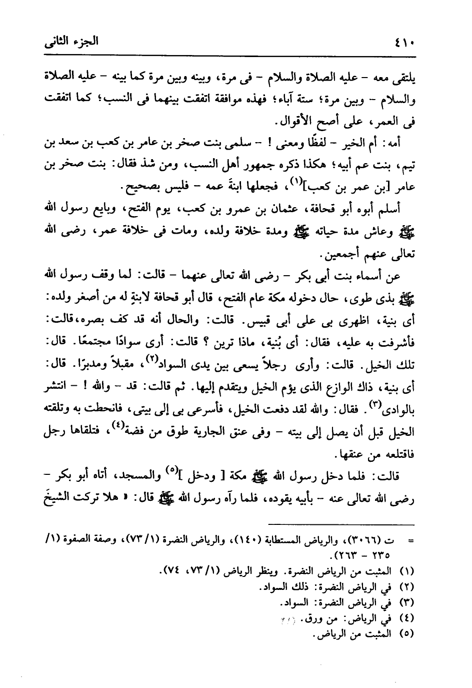 يلتقي مَعَه عَلَيْهِ الصَّلَاة وَالسَّلَام فِي مرّة وَبَينه وَبَين مرّة كَمَا بَينه عَلَيْهِ الصَّلَاة وَالسَّلَام وَبَين مرّة سِتَّة آبَاء فَهَذِهِ مُوَافقَة اتّفقت بَينهمَا فِي النّسَب كَمَا اتّفقت فِي الْعُمر على أصح الْأَقْوَال أمه أم الْخَيْر لفظا وَمعنى سلمى بنت صَخْر بن عَامر بن كَعْب بن سعد بن تيم بنت عَم أَبِيه هَكَذَا ذكره جمهوره أهل النّسَب وَمن شَذَّ فَقَالَ بنت صَخْر بن عَامر بن عمر بن كَعْب فَجَعلهَا ابنةَ عَمه فَلَيْسَ بِصَحِيح أسلم أَبوهُ أَبُو قُحَافَة عُثْمَان بن عَمْرو بن كَعْب يَوْم الْفَتْح وَبَايع رَسُول الله