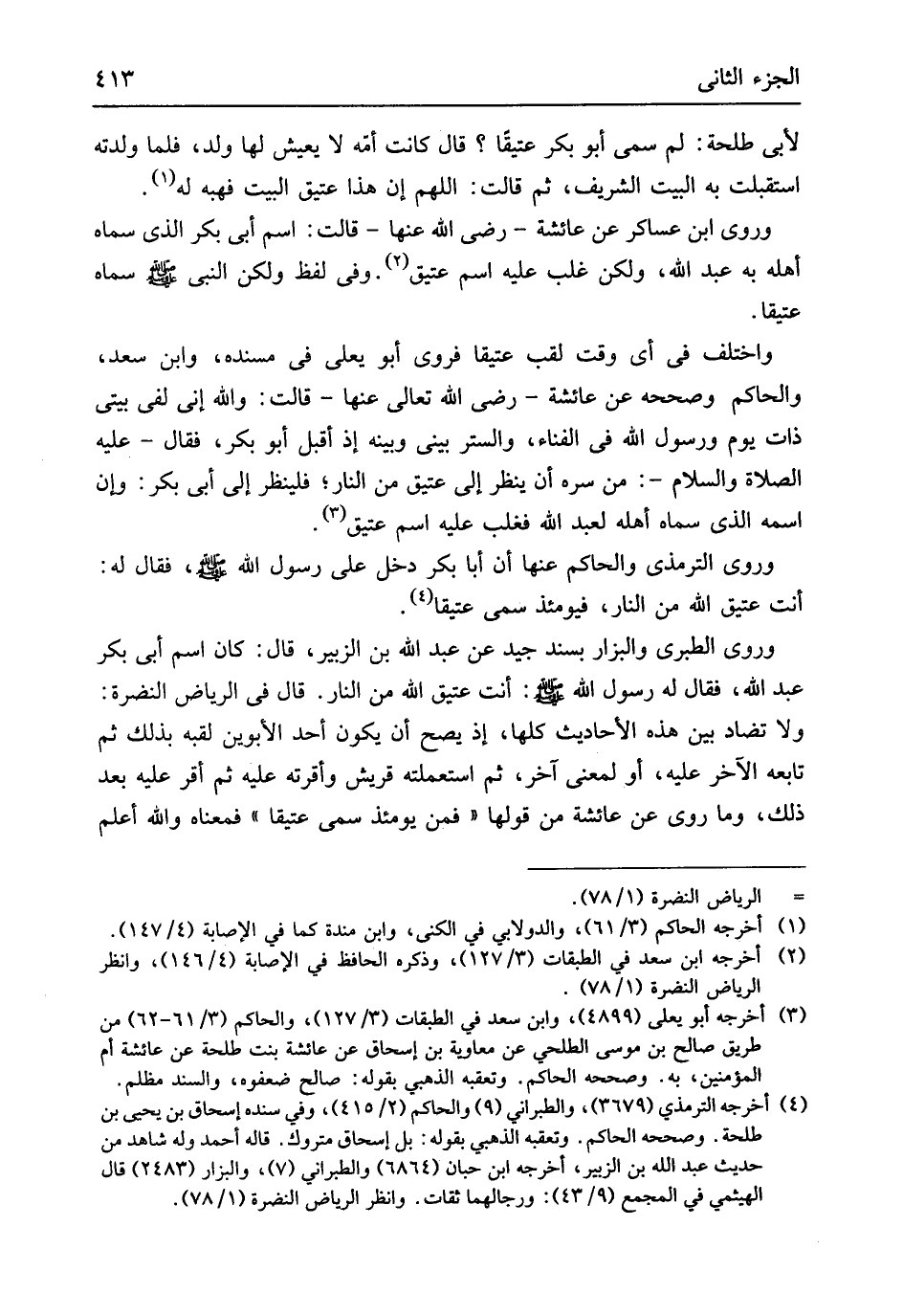 أَنْت عَتيق الله من النَّار قَالَ فِي الرياض النضرة وَلَا تضَاد بَين هَذِه الْأَحَادِيث كلهَا إِذْ يَصح أَن يكون أحد الْأَبَوَيْنِ لقبه بذلك ثمَّ تَابعه الآخر عَلَيْهِ أَو لِمَعْنى آخر ثمَّ استعملته قُرَيْش وأقرته عَلَيْهِ ثمَّ أقرّ عَلَيْهِ بعد ذَلِك وَمَا رُوِيَ عَن عَائِشَة من قَوْلهَا فَمن يَوْمئِذٍ سمي عتيقاً فَمَعْنَاه وَالله أعلم