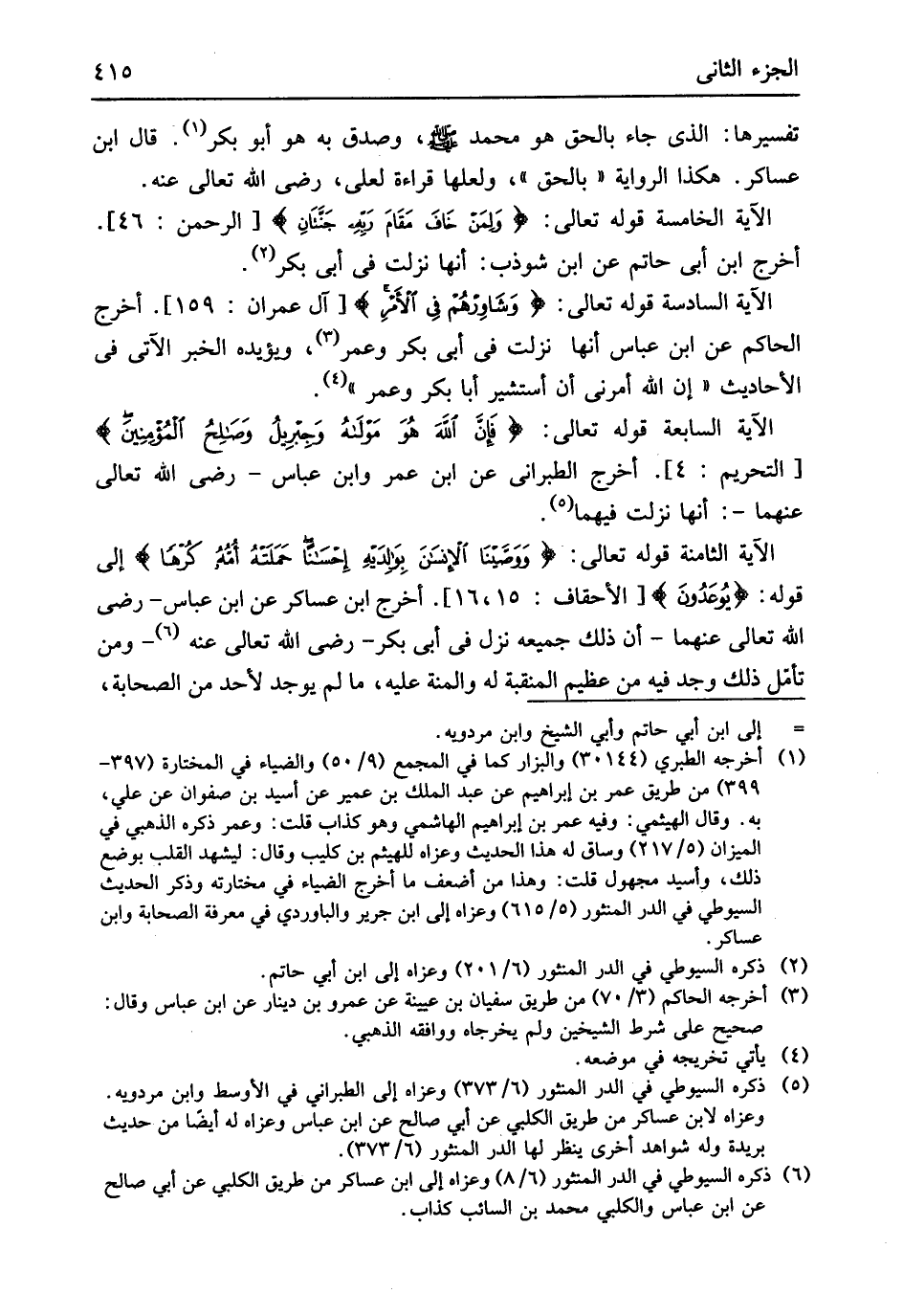 وَصدق بِهِ هُوَ أَبُو بكر قَالَ ابْن عَسَاكِر هَكَذَا الرِّوَايَة بِالْحَقِّ ولعلها قِرَاءَة لعَلي رَضِي الله تَعَالَى عَنهُ الْآيَة الْخَامِسَة قَوْله تَعَالَى {وَلمن خَافَ مقَام ربه جنتان} الرَّحْمَن 46 أخرج ابْن أبي حَاتِم عَن ابْن شَوْذَب أَنَّهَا نزلت فِي أبي بكر الْآيَة السَّادِسَة قَوْله تَعَالَى {وَشاوِرهُم فِي الأمرِ} آل عمرَان 159 أخرج الْحَاكِم عَن ابْن عَبَّاس أَنَّهَا نزلت فِي أبي بكر وَعمر وَيُؤَيِّدهُ الْخَبَر الْآتِي فِي الْأَحَادِيث