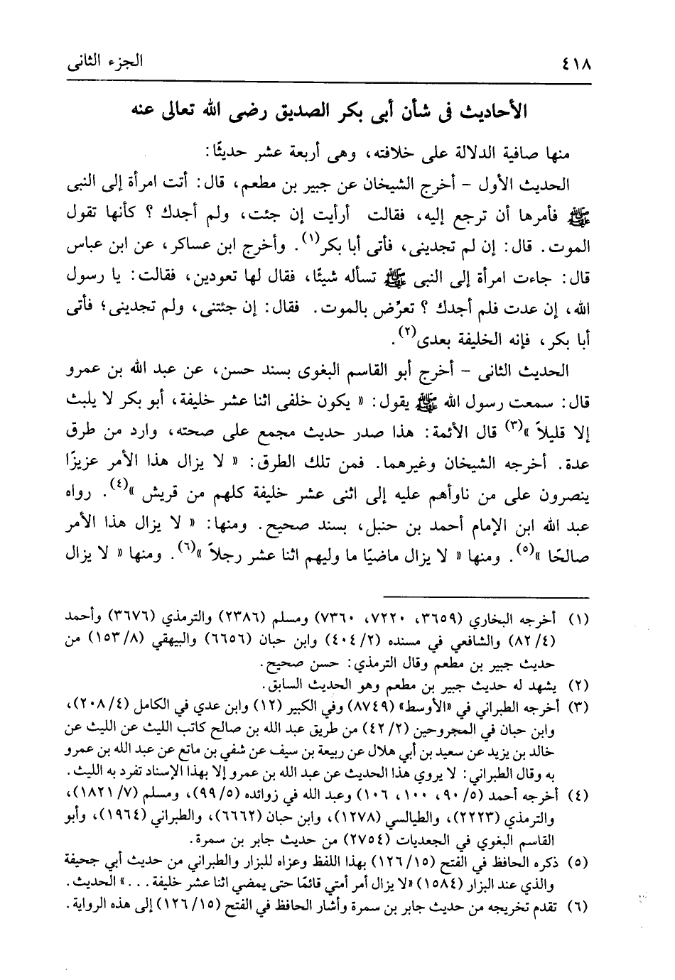 يَقُول يكون خَلْفي اثْنَا عشر خَليفَة أَبُو بكر لَا يلبث إِلَّا قَلِيلا قَالَ الْأَئِمَّة هَذَا صدر حَدِيث مجمع على صِحَّته وَارِد من طرق عدَّة أخرجه الشَّيْخَانِ وَغَيرهمَا فَمن تِلْكَ الطّرق لَا يزَال هَذَا الْأَمر عَزِيزًا ينْصرُونَ على من ناوأهم عَلَيْهِ إِلَى اثْنَي عشر خَليفَة كلهم من قُرَيْش رَوَاهُ عبد الله ابْن الإِمَام أَحْمد بن حَنْبَل // (بِسَنَد صَحِيح) // وَمِنْهَا لَا يزَال هَذَا الْأَمر صَالحا وَمِنْهَا لَا يزَال مَاضِيا مَا وليهم اثْنَا عشر رجلا وَمِنْهَا لَا يزَال