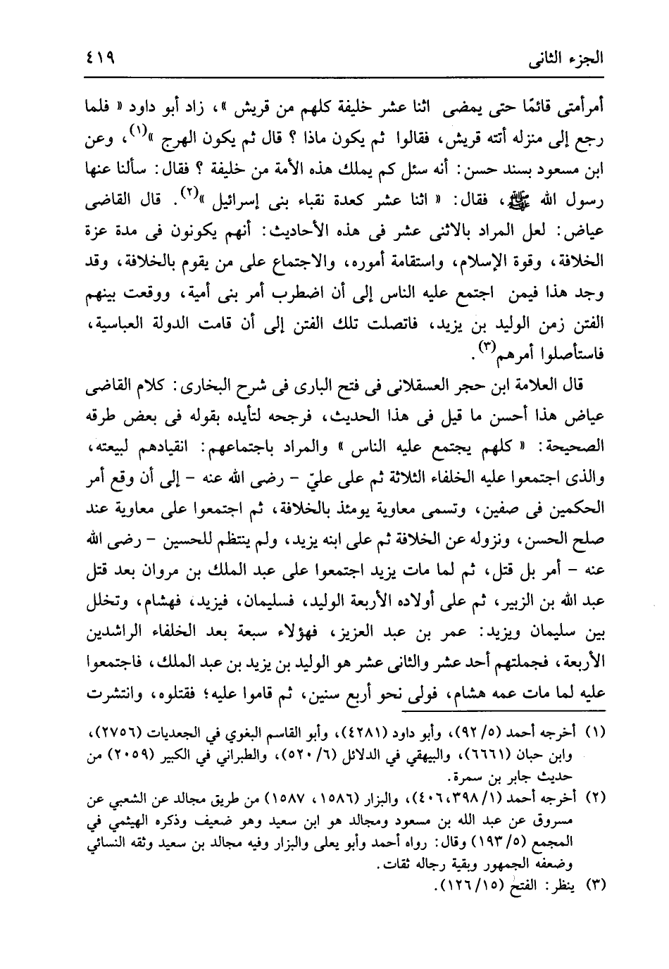 فَقَالَ اثْنَا عشر كعدة نقباء بني إِسْرَائِيل قَالَ القَاضِي عِيَاض لَعَلَّ المُرَاد بالاثني عشر فِي هَذِه الْأَحَادِيث أَنهم يكونُونَ فِي مُدَّة عزة الْخلَافَة وَقُوَّة الْإِسْلَام واستقامة أُمُوره والاجتماع على من يقوم بالخلافة وَقد وجد هَذَا فِيمَن اجْتمع عَلَيْهِ النَّاس إِلَى أَن اضْطربَ أَمر بني أُميَّة وَوَقعت بَينهم الْفِتَن زمن الْوَلِيد بن يزِيد فاتصلت تِلْكَ الْفِتَن إِلَى أَن قَامَت الدولة العباسية فاستأصلوا أَمرهم قَالَ الْعَلامَة ابْن حجر الْعَسْقَلَانِي فِي فتح الْبَارِي فِي شرح البُخَارِيّ كَلَام القَاضِي عِيَاض هَذَا أحسن مَا قيل فِي هَذَا الحَدِيث فرجحه لتأيده بقوله فِي بعض طرقه الصَّحِيحَة كلهم يجْتَمع عَلَيْهِ النَّاس وَالْمرَاد باجتماعهم انقيادهم لبيعته وَالَّذِي اجْتَمعُوا عَلَيْهِ الْخُلَفَاء الثَّلَاثَة ثمَّ على عَليّ رَضِي الله عَنهُ إِلَى أَن وَقع أَمر الْحكمَيْنِ فِي صفّين وَتسَمى مُعَاوِيَة يَوْمئِذٍ بالخلافة ثمَّ اجْتَمعُوا على مُعَاوِيَة عِنْد صلح الْحسن ونزوله عَن الْخلَافَة ثمَّ على ابْنه يزِيد وَلم يَنْتَظِم للحسين رَضِي الله عَنهُ أَمر بل قتل ثمَّ لما مَاتَ يزِيد اجْتَمعُوا على عبد الْملك بن مَرْوَان بعد قتل عبد الله بن الزبير ثمَّ على أَوْلَاده الْأَرْبَعَة الْوَلِيد فسليمان فيزيد فهشام وتخلل بَين سُلَيْمَان وَيزِيد عمر بن عبد الْعَزِيز فَهَؤُلَاءِ سَبْعَة بعد الْخُلَفَاء الرَّاشِدين الْأَرْبَعَة فجملتهم أحد عشر وَالثَّانِي عشر هُوَ الْوَلِيد بن يزِيد بن عبد الْملك فَاجْتمعُوا عَلَيْهِ لما مَاتَ عَمه هِشَام فولى نَحْو أَربع سِنِين ثمَّ قَامُوا عَلَيْهِ فَقَتَلُوهُ وانتشرت