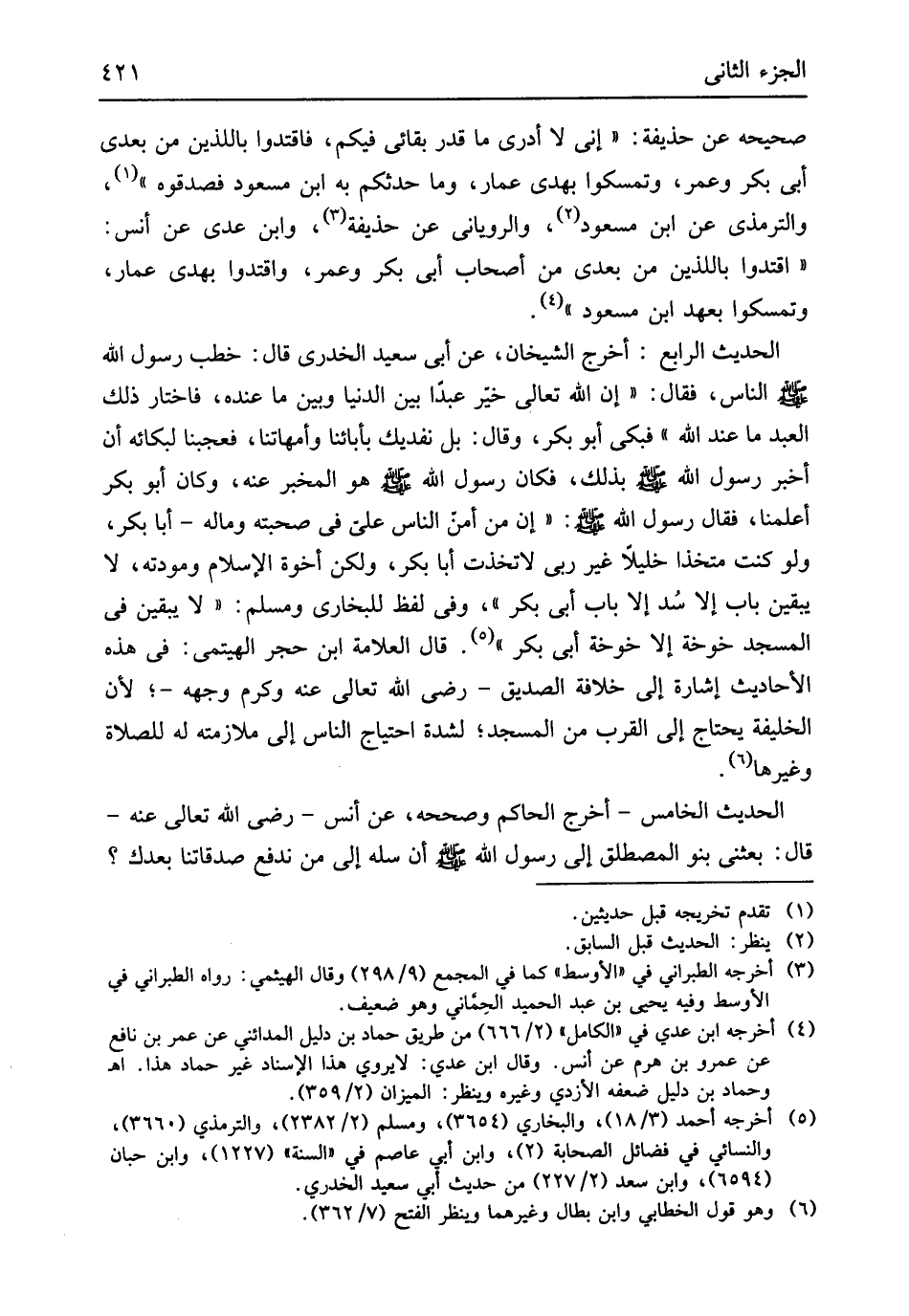 صَحِيحه عَن حُذَيْفَة إِنِّي لَا أَدْرِي مَا قدر بقائي فِيكُم فاقتدوا باللذين من بعدِي أبي بكر وَعمر وتمسكوا بِهَدي عمار وَمَا حَدثكُمْ بِهِ ابْن مَسْعُود فصدقوه وَالتِّرْمِذِيّ عَن ابْن مَسْعُود وَالرُّويَانِيّ عَن حُذَيْفَة وَابْن عدي عَن أنس اقتدوا باللذين من بعدِي من أَصْحَاب أبي بكر وَعمر وَاقْتَدوا بِهَدي عمار وتمسكوا بِعَهْد ابْن مَسْعُود