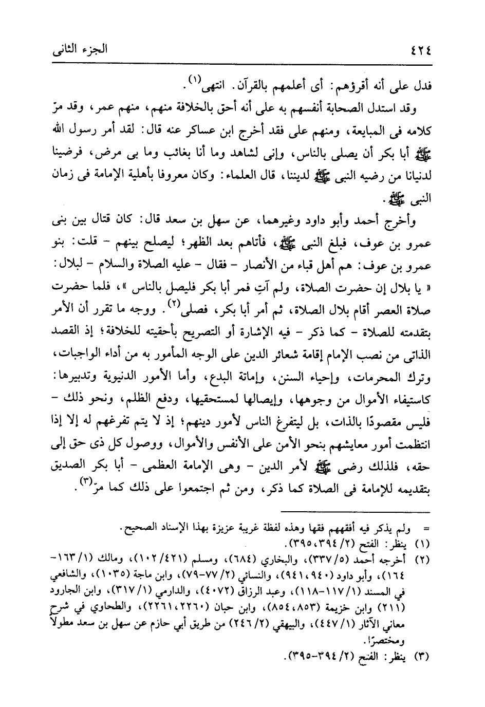 فَدلَّ على أَنه أقرؤهم أَي أعلمهم بالقران انْتهى وَقد اسْتدلَّ الصَّحَابَة أنفسهم بِهِ على أَنه أَحَق بالخلافة مِنْهُم مِنْهُم عمر وَقد مر كَلَامه فِي الْمُبَايعَة وَمِنْهُم عَليّ فقد أخرج ابْن عَسَاكِر عَنهُ قَالَ لقد أَمر رَسُول الله