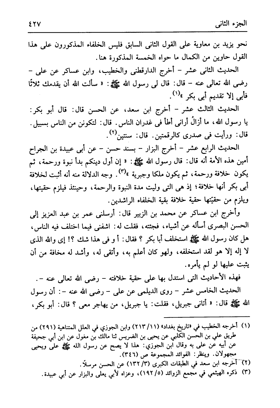 إِن أول دينكُمْ بَدَأَ نبوة وَرَحْمَة ثمَّ يكون خلَافَة وَرَحْمَة ثمَّ يكون ملكا وَجَبْرِيَّة وَجه الدّلَالَة مِنْهُ أَنه أثبت لخلافة أبي بكر أَنَّهَا خلَافَة إِذْ هِيَ الَّتِي وليت مُدَّة النُّبُوَّة وَالرَّحْمَة وَحِينَئِذٍ فَيلْزم حقيتها وَيلْزم من حقيتها حقية خلَافَة بَقِيَّة الْخُلَفَاء الرَّاشِدين وَأخرج ابْن عَسَاكِر عَن مُحَمَّد بن الزبير قَالَ أَرْسلنِي عمر بن عبد الْعَزِيز إِلَى الْحسن الْبَصْرِيّ أسأله عَن أَشْيَاء فَجِئْته فَقلت لَهُ اشفني فِيمَا اخْتلف فِيهِ النَّاس هَل كَانَ رَسُول الله