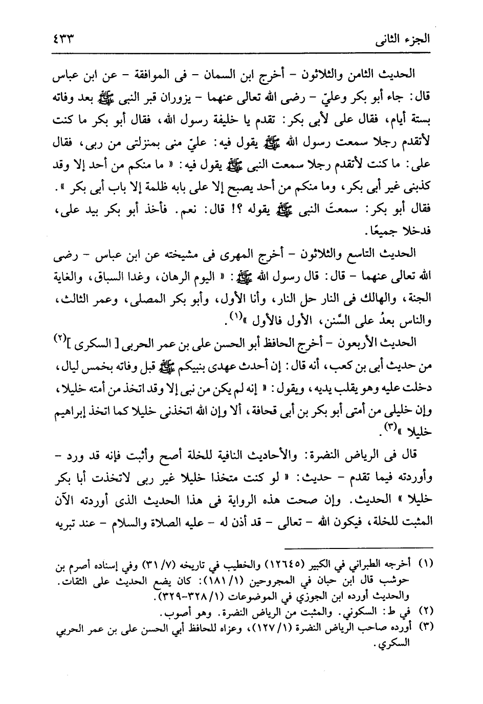 الحَدِيث الثَّامِن وَالثَّلَاثُونَ اخْرُج ابْن السمان فِي الْمُوَافقَة عَن ابْن عَبَّاس قَالَ جَاءَ أَبُو بكر وَعلي رَضِي الله تَعَالَى عَنْهُمَا يزوران قبر النَّبِي