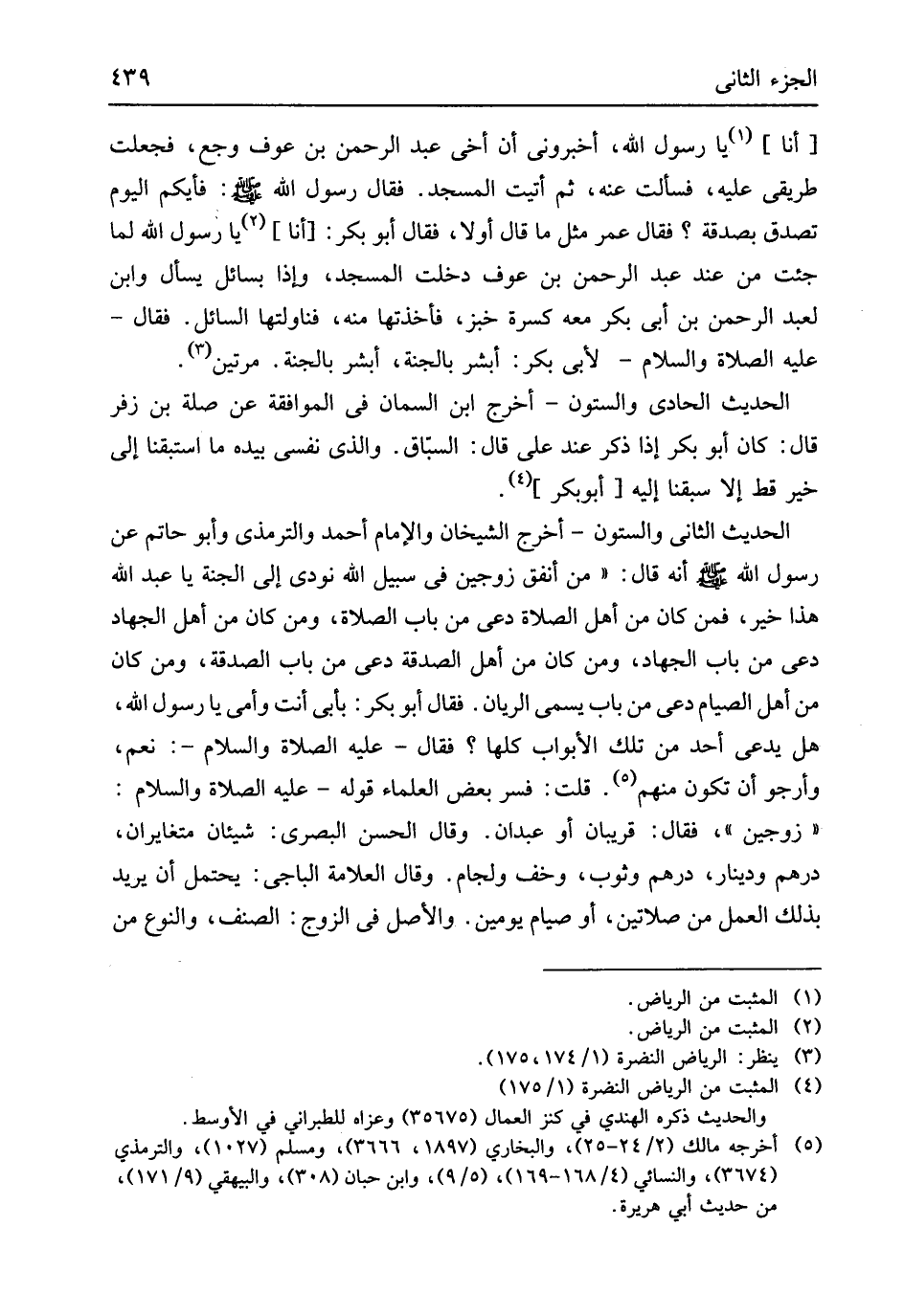 أَنه قَالَ من أنْفق زَوْجَيْنِ فِي سَبِيل الله نُودي إِلَى الْجنَّة يَا عبد الله هَذَا خير فَمن كَانَ من أهل الصَّلَاة دعِي من بَاب الصَّلَاة وَمن كَانَ من أهل الْجِهَاد دعِي من بَاب الْجِهَاد وَمن كَانَ من أهل الصَّدَقَة دعى من بَاب الصَّدَقَة وَمن كَانَ من أهل الصّيام دعى من بَاب يُسمى الريان فَقَالَ أَبُو بكر بِأبي أَنْت وَأمي يَا رَسُول الله هَل يدعى أحد من تِلْكَ الْأَبْوَاب كلهَا فَقَالَ عَلَيْهِ الصَّلَاة وَالسَّلَام نعم وَأَرْجُو أَن تكون مِنْهُم قلت فسر بعض الْعلمَاء قَوْله عَلَيْهِ الصَّلَاة وَالسَّلَام زَوْجَيْنِ فَقَالَ قريبان أَو عَبْدَانِ وَقَالَ الْحسن الْبَصْرِيّ شَيْئَانِ متغايران دِرْهَم ودينار دِرْهَم وثوب وخف ولجام وَقَالَ الْعَلامَة الْبَاجِيّ يحْتَمل أَن يُرِيد بذلك الْعَمَل من صَلَاتَيْنِ أَو صِيَام يَوْمَيْنِ وَالْأَصْل فِي الزَّوْج الصِّنْف وَالنَّوْع من