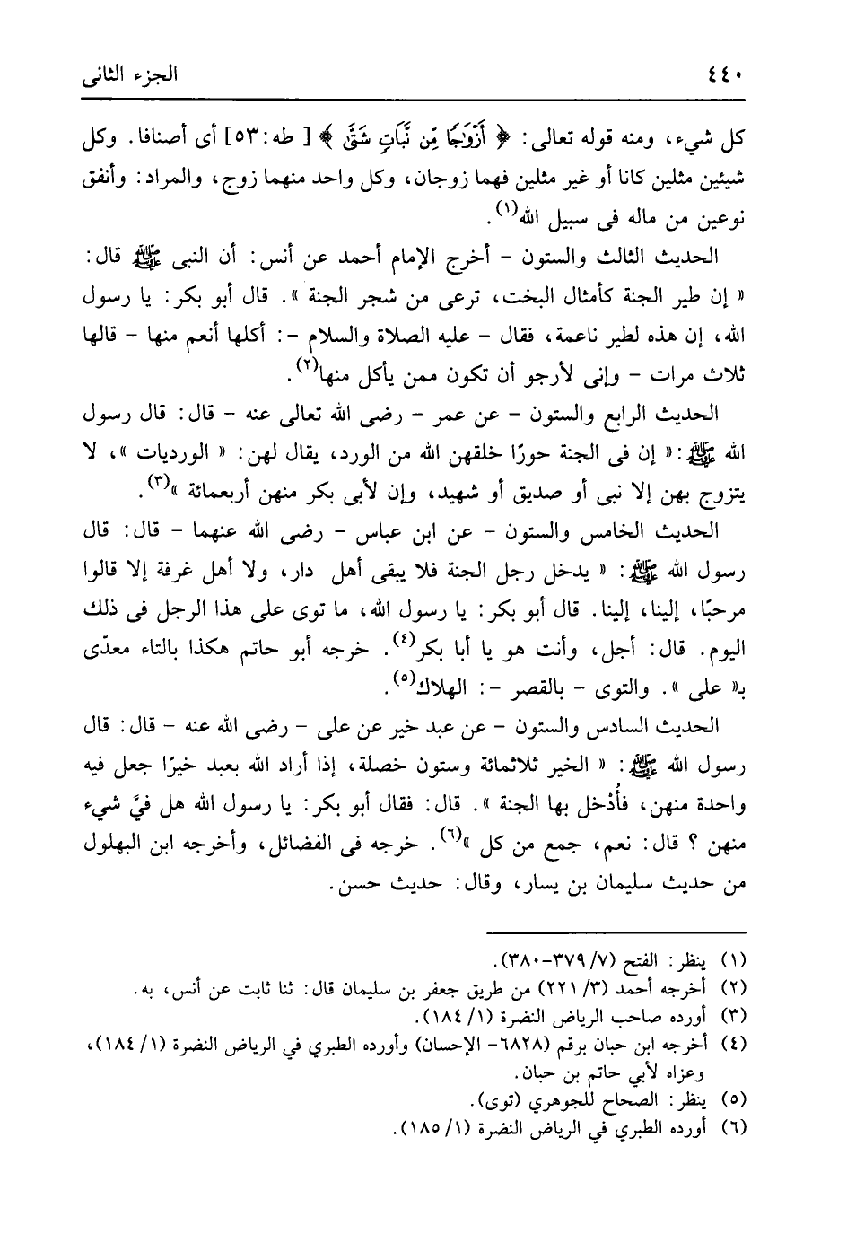 إِن فِي الْجنَّة حوراً خَلقهنَّ الله من الْورْد يُقَال لَهُنَّ الورديات لَا يتَزَوَّج بِهن إِلَّا نَبِي أَو صديق أَو شَهِيد وَإِن لأبي بكر مِنْهُنَّ أَرْبَعمِائَة