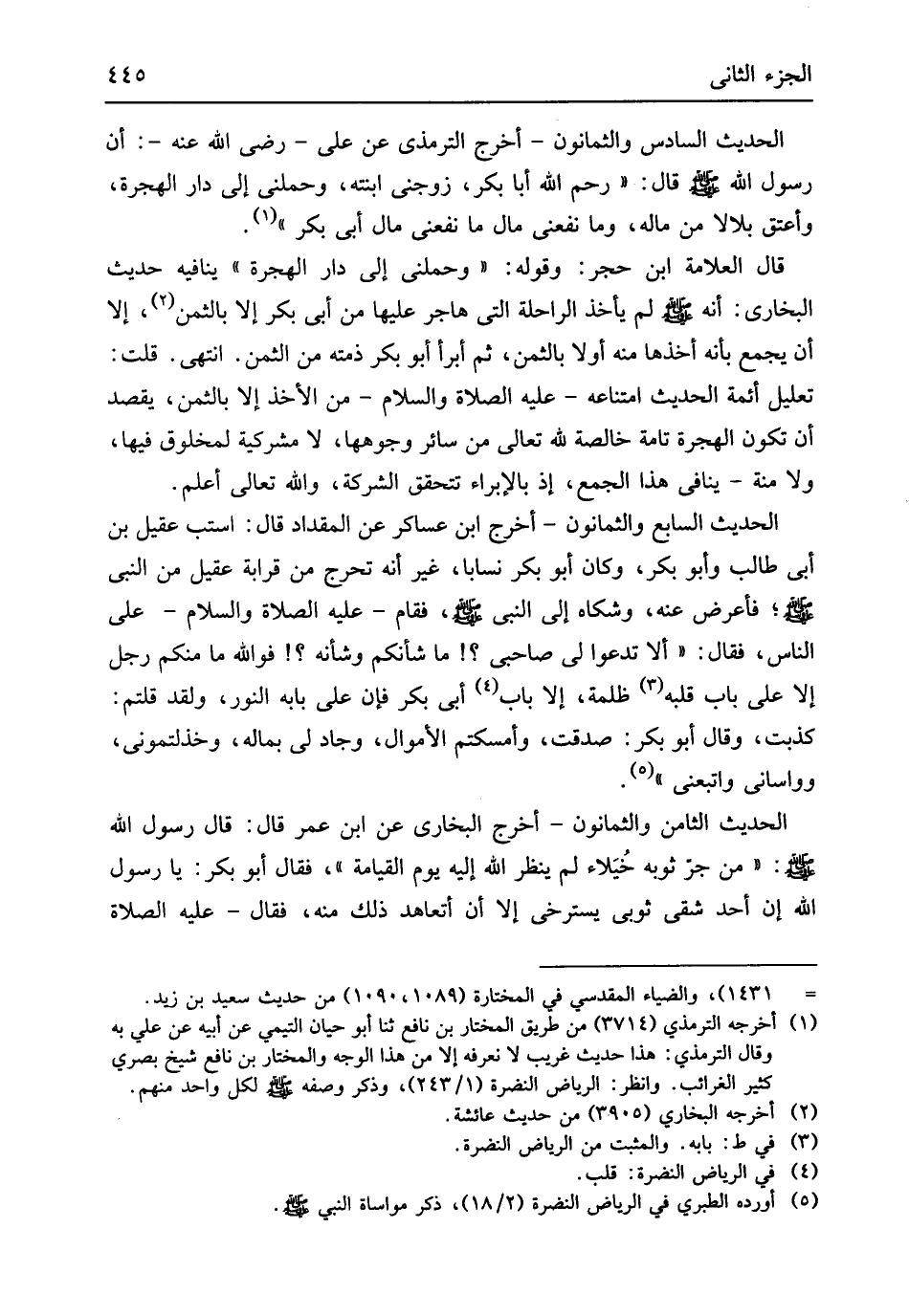 قَالَ رحم الله أَبَا بكر زَوجنِي ابْنَته وحملني إِلَى دَار الْهِجْرَة وَأعْتق بِلَالًا من مَاله وَمَا نَفَعَنِي مَال مَا نَفَعَنِي مَال أبي بكر قَالَ الْعَلامَة ابْن حجر وَقَوله وحملني إِلَى دَار الْهِجْرَة يُنَافِيهِ حَدِيث البُخَارِيّ أَنه