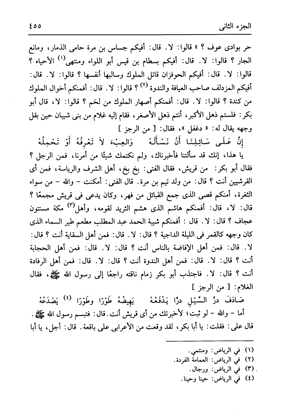 يَا هَذَا إِنَّك قد سألتنا فأخبرناك وَلم نكتمك شَيْئا من أمرنَا فَمن الرجل فَقَالَ أَبُو بكر من قُرَيْش فَقَالَ الْفَتى بخ بخ أهل الشّرف والرياسة فَمن أَي القرشيين أَنْت قَالَ من ولد تيم بن مرّة قَالَ الْفَتى أمكنت وَالله من سَوَاء الثغرة أمنكم قصي الَّذِي جمع الْقَبَائِل من فهر وَكَانَ يدعى فِي قُرَيْش مجمعا قَالَ لَا قَالَ أفمنكم هَاشم الَّذِي هشم الثَّرِيد لِقَوْمِهِ وَأهل مَكَّة مسنتون عجاف قَالَ لَا قَالَ أفمنكم شيبَة الْحَمد عبد الْمطلب مطعم طير السَّمَاء الَّذِي كَانَ وَجهه كَالْقَمَرِ فِي اللَّيْلَة الداجية قَالَ لَا قَالَ فَمن أهل السِّقَايَة أَنْت قَالَ لَا قَالَ فَمن أهل الْإِفَاضَة بِالنَّاسِ أَنْت قَالَ لَا قَالَ فَمن أهل الحجابة أَنْت قَالَ لَا قَالَ فَمن أهل الندوة أَنْت قَالَ لَا قَالَ فَمن أهل الرفادة أَنْت قَالَ لَا فاجتذب أَبُو بكر زِمَام نَاقَته رَاجعا إِلَى رَسُول الله
