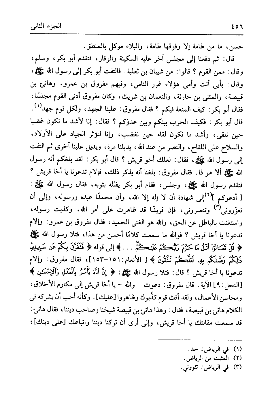 {قُل تَعالوا أتلُ مَا حَرَمَ رَبكُم عَليكُم} إِلَى قَوْله {فَتَفَرَقَ بِكم عَن سبيلِه ذَلِكم وَصاكُم بِهِ لَعَلَكم تَتَقونَ} الْأَنْعَام 151 - 153 فَقَالَ مفروق وإلام تدعونا يَا أَخا قُرَيْش قَالَ فَتلا رَسُول الله