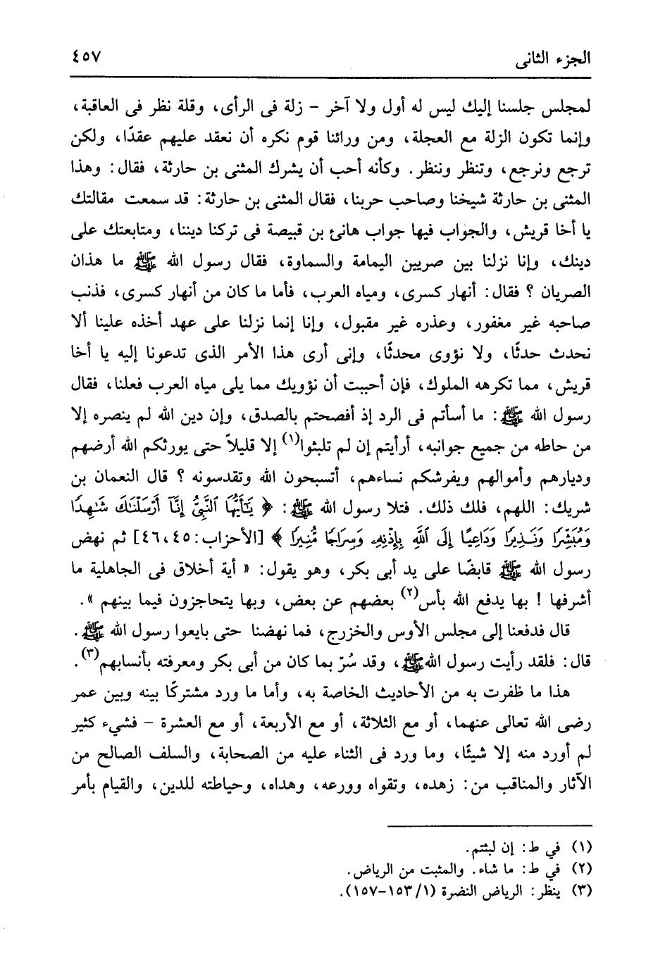 لمجلس جلسنا إِلَيْك لَيْسَ لَهُ أول وَلَا آخر زلَّة فِي الرَّأْي وَقلة نظر فِي الْعَاقِبَة وَإِنَّمَا تكون الزلة مَعَ العجلة وَمن وَرَائِنَا قوم نكره أَن نعقد عَلَيْهِم عقدا وَلَكِن ترجع وَنَرْجِع وَتنظر وَنَنْظُر وَكَأَنَّهُ أحب أَن يُشْرك الْمثنى بن حَارِثَة فَقَالَ وَهَذَا الْمثنى بن حَارِثَة شَيخنَا وَصَاحب حربنا فَقَالَ الْمثنى بن حَارِثَة قد سَمِعت مَقَالَتك يَا أَخا قُرَيْش وَالْجَوَاب فِيهَا جَوَاب هانىء بن قبيصَة فِي تركنَا ديننَا ومتابعتك على دينك وَإِنَّا نزلنَا بَين صريين الْيَمَامَة والسماوة فَقَالَ رَسُول الله
