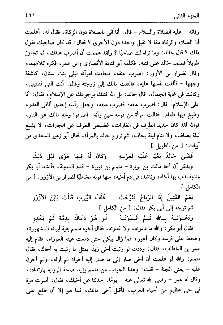 وَفَاته عَلَيْهِ الصَّلَاة وَالسَّلَام قَالَ أَنا آتِي بِالصَّلَاةِ دون الزَّكَاة فَقَالَ لَهُ أعلمت أَن الصَّلَاة وَالزَّكَاة مَعًا لَا تقبل وَاحِدَة دون الْأُخْرَى فَقَالَ قد كَانَ صَاحبك يَقُول ذَلِك قَالَ خَالِد وَمَا ترَاهُ لَك صاحباً وَلَقَد هَمَمْت أَن أضْرب عُنُقك ثمَّ تجَاوز طَويلا فصمم خَالِد على قَتله فَكَلمهُ أَبُو قَتَادَة الْأنْصَارِيّ وَابْن عمر فكره كَلَامهمَا وَقَالَ لِضِرَار بن الْأَزْوَر اضْرِب عُنُقه فَجَاءَت امْرَأَته ليلى بنت سِنَان كاشفة وَجههَا فَأَلْقَت نَفسهَا عَلَيْهِ فَالْتَفت مَالك إِلَى زَوجته وَقَالَ أَنْت الَّتِي قتلتيني وَكَانَت فِي غَايَة الْجمال قَالَ خَالِد بل الله قَتلك برجوعك عَن الْإِسْلَام فَقَالَ أَنا على الْإِسْلَام قَالَ اضْرِب عُنُقه فَضرب عُنُقه وَجعل رَأسه إِحْدَى أثافي الْقدر وطبخ فِيهَا طَعَام فَقَالَت امْرَأَة من قومه حِين رَأَتْهُ اصرفوا وَجه مَالك عَن النَّار فوَاللَّه لقد كَانَ حَدِيد الطّرف فِي الغارات غضيض الطّرف عَن الجارات لَا يشْبع لَيْلَة يُضَاف وَلَا ينَام لَيْلَة يخَاف ثمَّ تزوج خَالِد بِالْمَرْأَةِ فَقَالَ أَبُو زُهَيْر السَّعْدِيّ من أَبْيَات // (من الطَّوِيل) //
