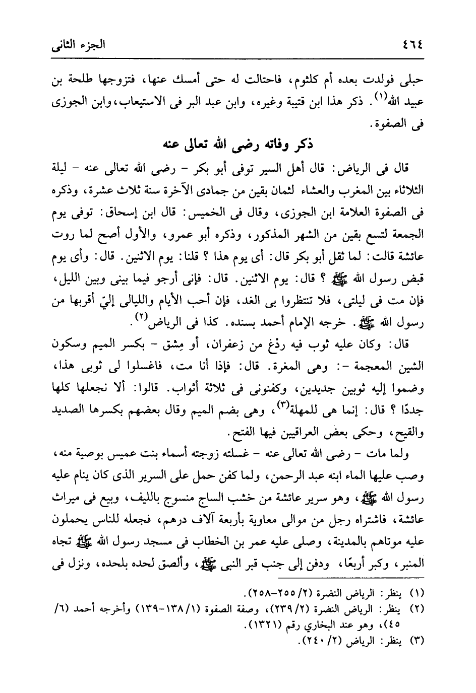 خرجه الإِمَام أَحْمد بِسَنَدِهِ كَذَا فِي الرياض قَالَ وَكَانَ عَلَيْهِ ثوب فِيهِ ردغ من زغفران أَو مِشق بِكَسْر الْمِيم وَسُكُون الشين الْمُعْجَمَة وَهِي الْمغرَة قَالَ فَإِذا أَنا مت فَاغْسِلُوا لي ثوبي هَذَا وضموا إِلَيْهِ ثَوْبَيْنِ جديدين وكفنوني فِي ثَلَاثَة أَثوَاب قَالُوا أَلا نَجْعَلهَا كلهَا جدداً قَالَ إِنَّمَا هِيَ للمهلة وَهِي بِضَم الْمِيم وَقَالَ بَعضهم بِكَسْرِهَا الصديد والقيح وَحكى بعض الْعِرَاقِيّين فِيهَا الْفَتْح وَلما مَاتَ رَضِي الله تَعَالَى عَنهُ غسلته زَوجته أَسمَاء بنت عُمَيْس بِوَصِيَّة مِنْهُ وصب عَلَيْهَا المَاء ابْنه عبد الرَّحْمَن وَلما كفن حمل على السرير الَّذِي كَانَ ينَام عَلَيْهِ رَسُول الله