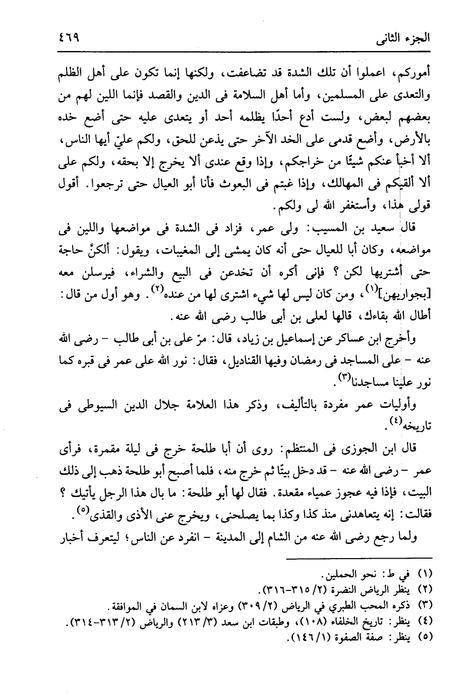 أُمُوركُم اعلموا أَن تِلْكَ الشدَّة قد تضاعفت وَلكنهَا إِنَّمَا تكون على أهل الظُّلم والتعدي على الْمُسلمين وَأما أهل السَّلامَة فِي الدّين وَالْقَصْد فَإِنَّمَا اللين لَهُم من بَعضهم لبَعض وَلست أدع أحدا يَظْلمه أحد أَو يتَعَدَّى عَلَيْهِ حَتَّى أَضَع خَدّه بِالْأَرْضِ وأضع قدمي على الخد الآخر حَتَّى يذعن للحق وَلكم عَليّ أَيهَا النَّاس أَلا أخبأ عَنْكُم شَيْئا من خراجكم وَإِذا وَقع عِنْدِي أَلا يخرج إِلَّا بِحقِّهِ وَلكم عَليّ أَلا ألقيكم فِي المهالك وَإِذا غبتم فِي الْبعُوث فَأَنا أَبُو الْعِيَال حَتَّى ترجعوا أَقُول قولي هَذَا وَأَسْتَغْفِر الله لي وَلكم قَالَ سعيد بن الْمسيب ولي عمر فَزَاد فِي الشدَّة فِي موَاضعهَا واللين فِي موَاضعه وَكَانَ أَبَا للعيال حَتَّى أَنه يمشي إِلَى المغيبات وَيَقُول ألكن حَاجَة حَتَّى أشتريها لَكِن فَإِنِّي أكره أَن تخدعن فِي البيع وَالشِّرَاء فيرسلن مَعَه بجواريهن وَمن كَانَ لَيْسَ لَهَا شَيْء اشْترى لَهَا من عِنْده وَهُوَ أول من قَالَ أَطَالَ الله بَقَاءَك قَالَهَا لعَلي بن أبي طَالب رَضِي الله عَنهُ