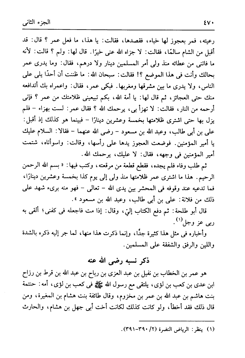 رَعيته فَمر بِعَجُوزٍ لَهَا خباء فقصدها فَقَالَت يَا هَذَا مَا فعل عمر قَالَ قد أقبل من الشَّام سالما فَقَالَت لَا جزاه الله عني خيرا قَالَ لَهَا وَلم قَالَت لِأَنَّهُ مَا فَاتَنِي من عطائه مُنْذُ ولي أَمر الْمُسلمين دِينَار وَلَا دِرْهَم فَقَالَ وَمَا يدْرِي عمر بحالك وَأَنت فِي هَذَا الْموضع فَقَالَت سُبْحَانَ الله مَا ظَنَنْت أَن أحدا يَلِي على النَّاس وَلَا يدْرِي مَا بَين مشرقها وَمَغْرِبهَا فَبكى عمر فَقَالَ واعمراه بك أتدافعه مِنْك حَتَّى الْعَجَائِز ثمَّ قَالَ لَهَا يَا أمة الله بكم تبيعيني ظلامتك من عمر فَإِنِّي أرحمه من النَّار فَقَالَت لَا تهزأ بِي يَرْحَمك الله فَقَالَ عمر لست بهزاء فَلم يزل بهَا حَتَّى اشْترى ظلامتها بِخَمْسَة وَعشْرين دِينَارا فَبَيْنَمَا هُوَ كَذَلِك إِذْ أقبل عَليّ بن أبي طَالب وَعبد الله بن مَسْعُود رَضِي الله عَنْهُمَا فَقَالَا السَّلَام عَلَيْك يَا أَمِير الْمُؤمنِينَ فَوضعت الْعَجُوز يَدهَا على رَأسهَا وَقَالَت واسوأتاه شتمت أَمِير الْمُؤمنِينَ فِي وَجهه فَقَالَ لَا عَلَيْك يَرْحَمك الله ثمَّ طلب وَفَاء فَلم يجده فَقطع قِطْعَة من مرقعته وَكتب فِيهَا بِسم الله الرَّحْمَن الرَّحِيم هَذَا مَا اشْترى عمر ظلامتها مُنْذُ ولي إِلَى يَوْم كَذَا بِخَمْسَة وَعشْرين دِينَارا فَمَا تدعيه عِنْد وُقُوفه فِي الْمَحْشَر بَين يَدي الله تَعَالَى فَهُوَ مِنْهُ بَرِيء شهد على ذَلِك من فُلَانَة عَليّ بن أبي طَالب وَعبد الله بن مَسْعُود قَالَ أَبُو طَلْحَة ثمَّ دفع الْكتاب إِلَيّ وَقَالَ إِذا مت فاجعله فِي كفني ألْقى بِهِ رَبِّي عز وَجل وأخباره فِي مثل هَذَا كَثِيرَة جدا وَإِنَّمَا ذكرت هَذَا مِنْهَا لما جر إِلَيْهِ ذكره بالشدة واللين والرفق والشفقة على الْمُسلمين
