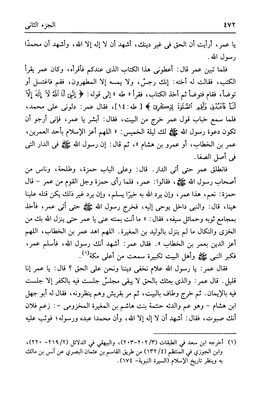 يَا عمر أَرَأَيْت أَن الْحق فِي غير دينك أشهد أَن لَا إِلَه إِلَّا الله وَأشْهد أَن مُحَمَّدًا رَسُول الله فَلَمَّا تبين عمر قَالَ أعطوني هَذَا الْكتاب الَّذِي عنْدكُمْ فَأَقْرَأهُ وَكَانَ عمر يقْرَأ الْكتب فَقَالَت لَهُ أُخْته إِنَّك رِجْس وَلَا يمسهُ إِلَّا الْمُطهرُونَ فَقُمْ فاغتسل أَو تَوَضَّأ فَقَامَ فَتَوَضَّأ ثمَّ أَخذ الْكتاب فَقَرَأَ طه إِلَى قَوْله {إِنني أَنا اللهُ لَا إِلَهَ إِلَّا أناَ فاعبدني وأقم الصَّلَاة لِذِكرِي} طه 14 فَقَالَ عمر دلوني على مُحَمَّد فَلَمَّا سمع الْخَبَّاب قَول عمر خرج من الْبَيْت فَقَالَ أبشر يَا عمر فإنى أَرْجُو أَن تكون دَعْوَة رَسُول الله