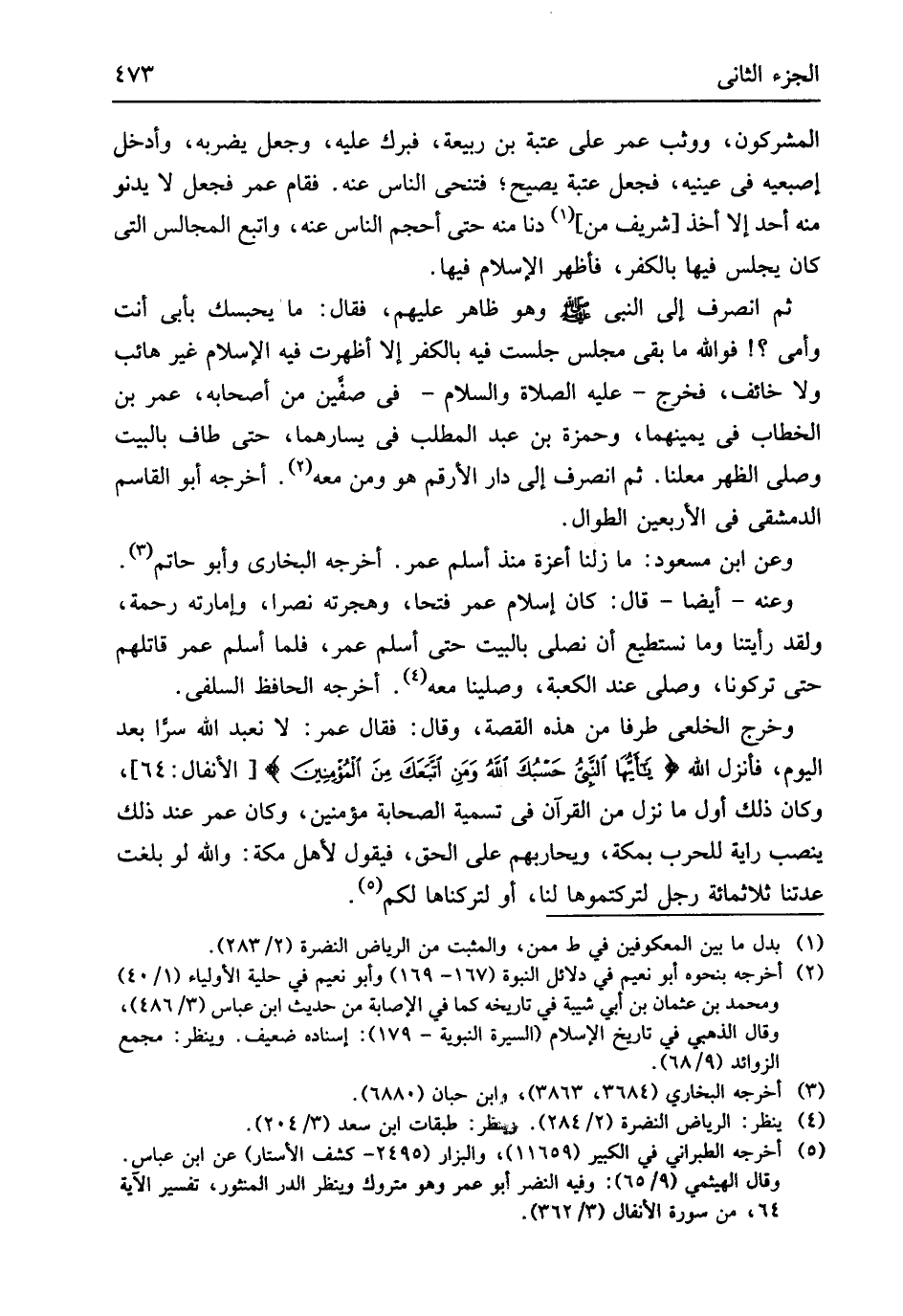 وَهُوَ ظَاهر عَلَيْهِم فَقَالَ مَا يحبسك بِأبي أَنْت وَأمي فوَاللَّه مَا بَقِي مجْلِس جَلَست فِيهِ بالْكفْر إِلَّا أظهرت فِيهِ الْإِسْلَام غير هائب وَلَا خَائِف فَخرج عَلَيْهِ الصَّلَاة وَالسَّلَام فِي صفّين من أَصْحَابه عمر بن الْخطاب فِي يمينهما وَحَمْزَة بن عبد الْمطلب فِي يسارهما حَتَّى طَاف بِالْبَيْتِ وَصلى الظّهْر مُعْلنا ثمَّ انْصَرف إِلَى دَار الأرقم هُوَ وَمن مَعَه أخرجه أَبُو الْقَاسِم الدِّمَشْقِي فِي الْأَرْبَعين الطوَال وَعَن ابْن مَسْعُود مَا زلنا أعزة مُنْذُ أسلم عمر أخرجه البُخَارِيّ وَأَبُو حَاتِم وَعنهُ أَيْضا قَالَ كَانَ إِسْلَام عمر فتحا وهجرته نصرا وإمارته رَحْمَة وَلَقَد رَأَيْتنَا وَمَا نستطيع أَن نصلي بِالْبَيْتِ حَتَّى أسلم عمر فَلَمَّا أسلم عمر قَاتلهم حَتَّى تركونا وَصلى عِنْد الْكَعْبَة وصلينا مَعَه أخرجه الْحَافِظ السلَفِي وَخرج الخلعي طرفا من هَذِه الْقِصَّة وَقَالَ فَقَالَ عمر لَا نعْبد الله سرا بعد الْيَوْم فَأنْزل الله {يَا أيَها النبيُ حَسبُكَ الله وَمن اتبعك من الْمُؤمنِينَ} الْأَنْفَال 64 وَكَانَ ذَلِك أول مَا نزل من الْقُرْآن فِي تَسْمِيَة الصَّحَابَة مُؤمنين وَكَانَ عمر عِنْد ذَلِك ينصب راية للحرب بِمَكَّة ويحاربهم على الْحق فَيَقُول لأهل مَكَّة وَالله لَو بلغت عدتنا ثَلَاثمِائَة رجل لتركتموها لنا أَو لتركناها لكم